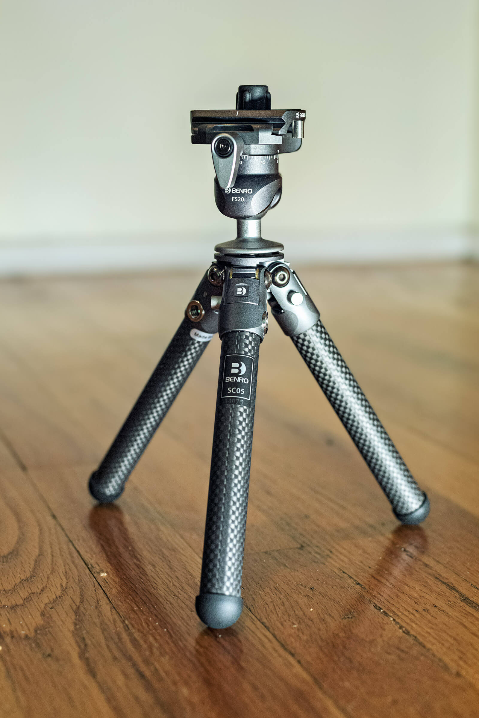 The tabletop kit I received includes a Benro SC05 tripod, a FS20 panoramic ball head, a PU45 quick-release plate, and an Allen wrench. It also includes a phone holder, which I almost missed! Also, you can wrap these up in a nice padded drawstring pouch.