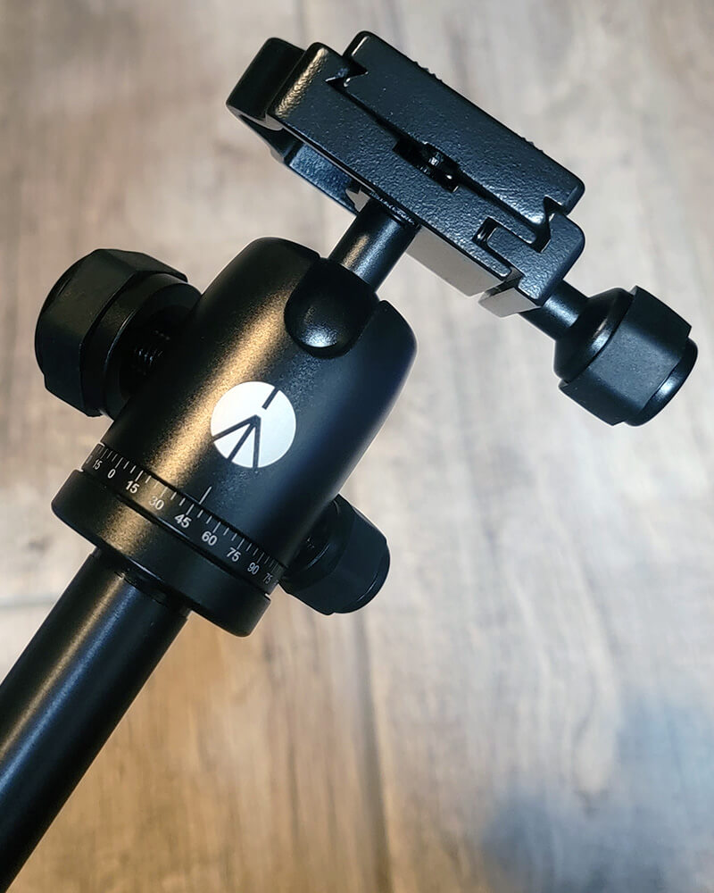 The Manfrotto Element Small Traveler Tripod ships with a dual-lock ball head. The main knob controls ball movement, and the secondary knob controls a 360-degree pan. The Arca-type head includes a ¼”-20 mounting screw. Nothing too fancy here, but it functions well and maintains the feather weight.