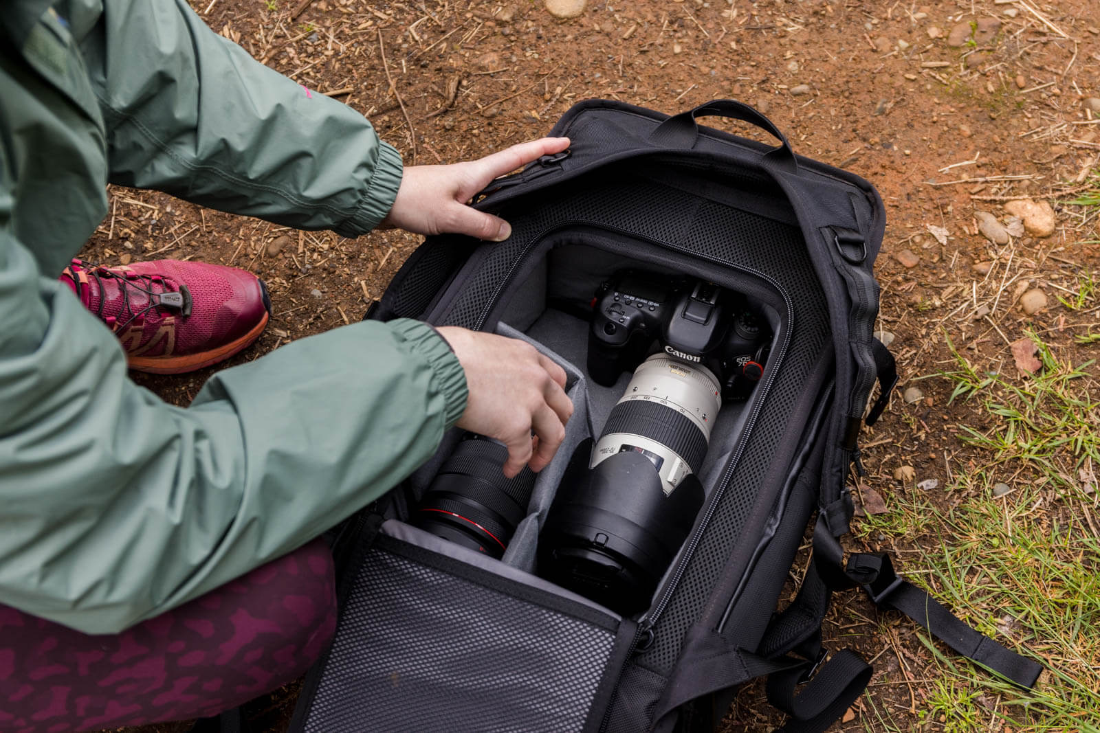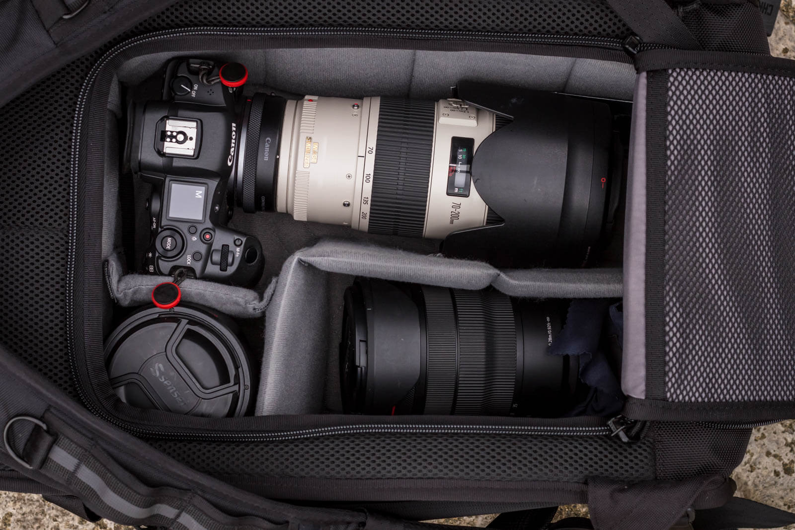 Like most camera bags, the main compartment of the Niko Camera Backpack 3.0 is fully customizable with removable modular dividers. I set mine up to be able to carry my go-to lens kit: A Canon EOS R5, 70-200mm lens with EF lens adapter, 24-70mm lens and 15-35mm lens. I loved being able to do this, because the bag I was using prior used a cube insert, and I was never able to place my camera with my 70-200mm lens attached inside the cube. With the Niko Camera Backpack I am able to do this easily.