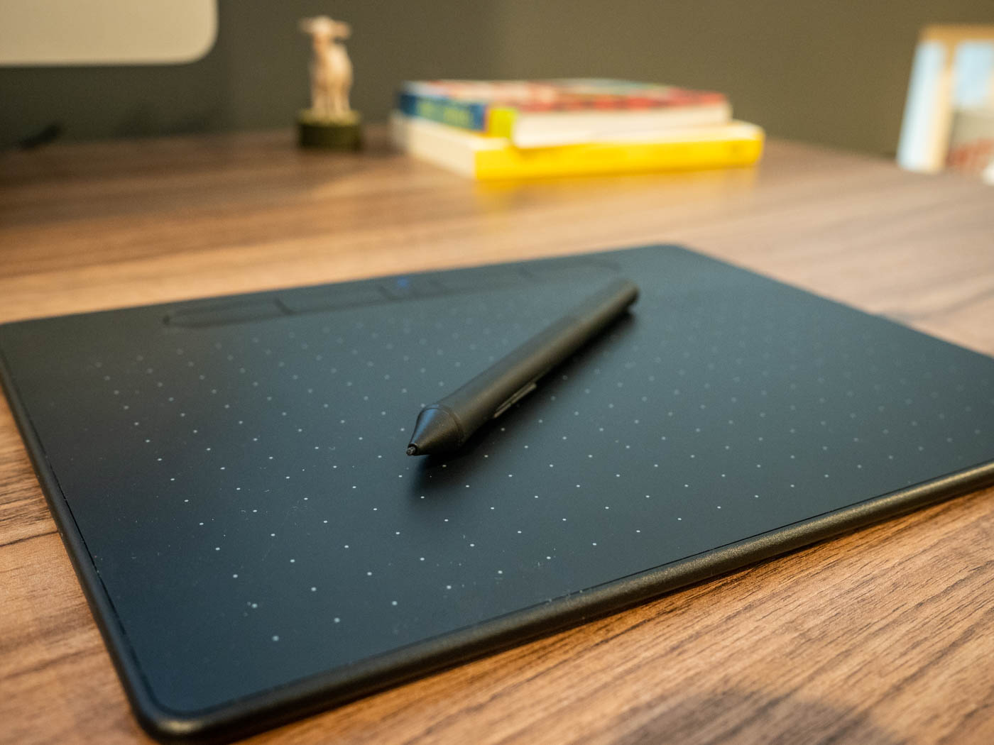 The Wacom Intuos Pen Tablet is Wacom’s entry-level tablet and features four customizable buttons at the top, along with a power button (which also triggers a Bluetooth connection). The tablet itself has a dot-grid appearance overlaid on a black surface. It’s smooth enough that you can precisely paint in Photoshop or adjust Lightroom sliders, while still being a great everyday device for browsing the web.