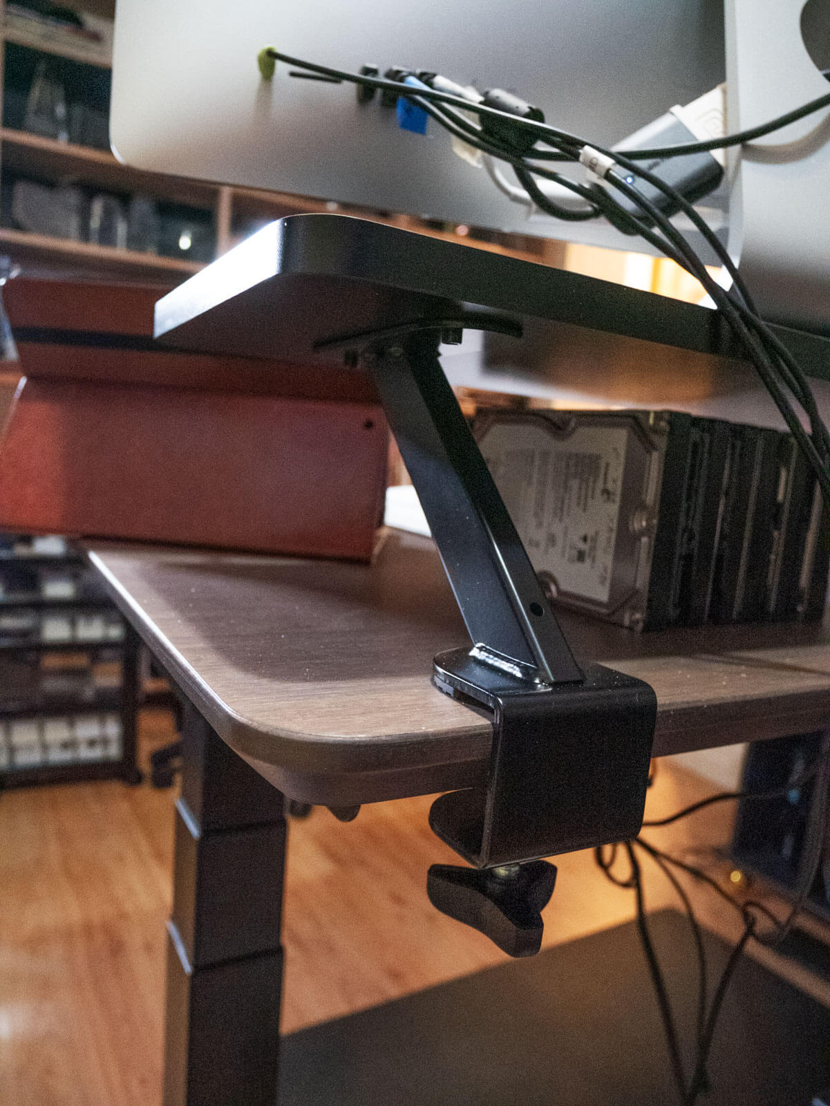 What got me excited? I now have a lot of extra desk space with the computer monitor raised. I can store back up drives underneath the shelf. That’s handy but I also end up with desk real estate which is nice because I tend to spread out with lots of ‘projects in process’ on a regular basis.