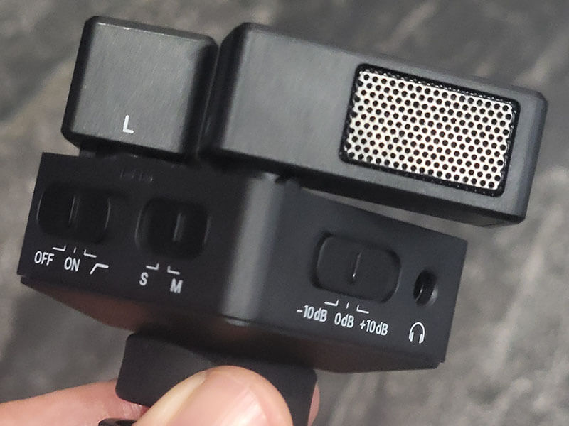 The two mics are rotatable by 180-degrees horizontally. The cardioid patterns help capture the sound you want and less of the surrounding noise you don’t. Mono and stereo modes are available, as well as three levels of adjustable gain. There is also a low cut function. Settings and buttons are easy to see on the mic itself despite its low profile.