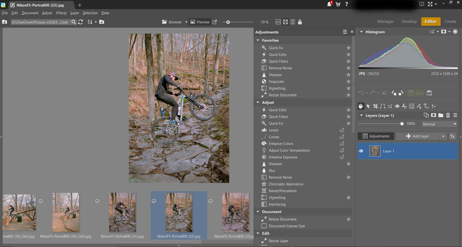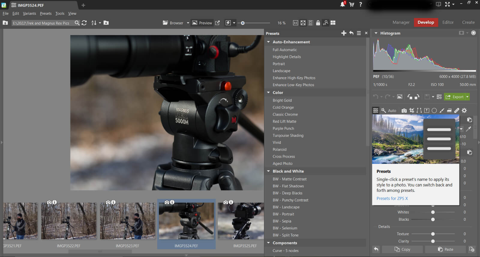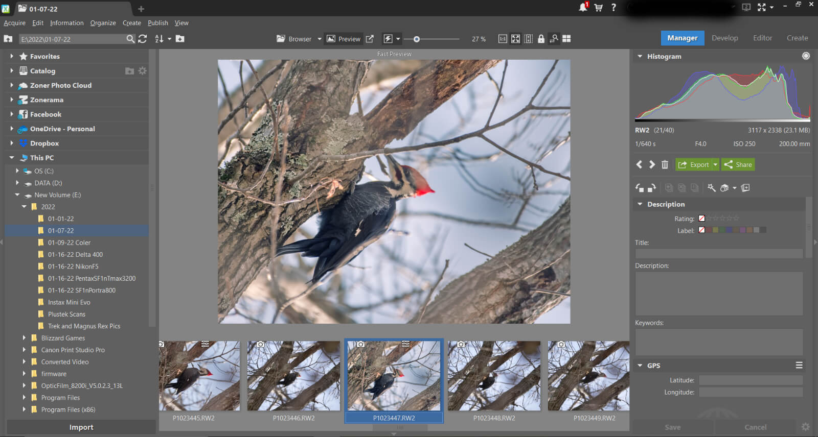 On the right side of the Manager module is a panel for data. This allows you to add tags, titles, keywords, location data, etc. It will also display a histogram and the photo’s EXIF data. Overall, the Manager module is generally smooth to operate and offers a clean interface.