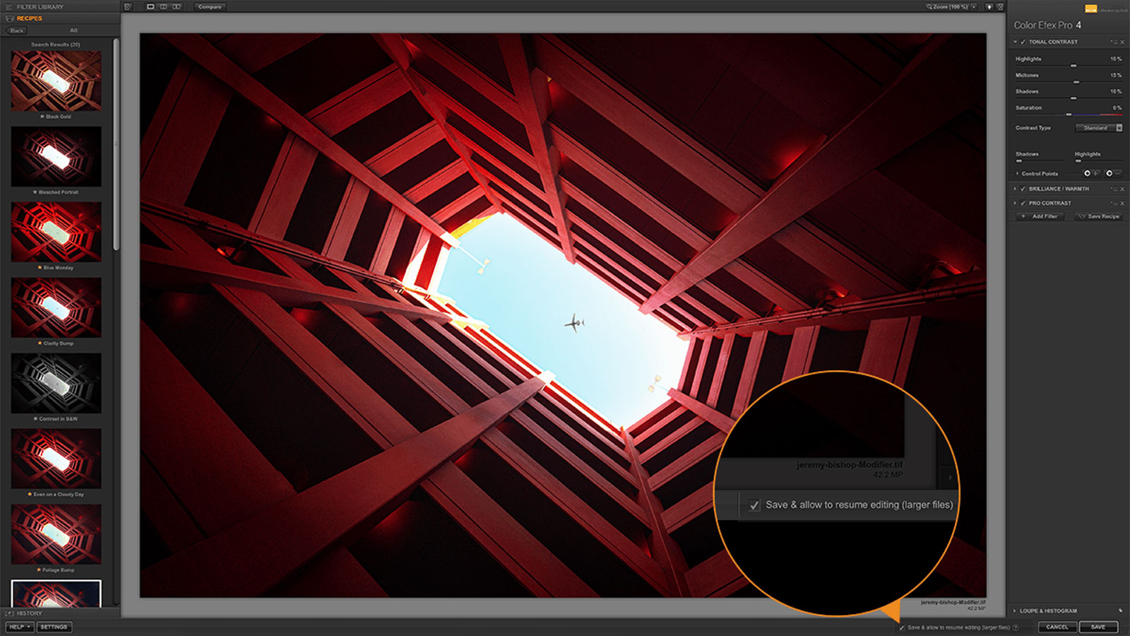 The nondestructive workflow is simple to use. Once you’ve exported your image to the plugin, just click the “Save and allow to resume editing” box. This gives you access to all of your edits and you can restart an editing session in the standalone mode in the same plug in as well. This nondestructive mode can also be activated for use with DxO PhotoLab, Serif Affinity Photo or ON1 Photo RAW.