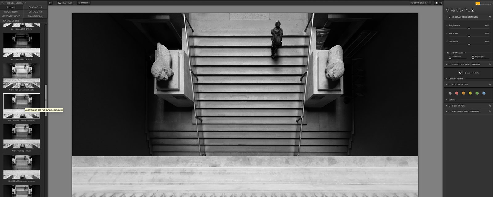 Color Efex Pro includes 55 filters and 20 recipes to use. These can all be customized and tweaked in an almost infinite number of ways. Silver Efex Pro has 48 presets and an exclusive range of filters and effects. Analog Efex comes with 90 tools and effects that give you the looks of classic cameras, lenses and films. Effects such as blur, bokeh, light leaks, vignetting and striping are also included. HDR Efex Pro covers the range from realistic to artistic using it’s advanced tone algorithms, multi-image/single image features and flare-reduction methods.