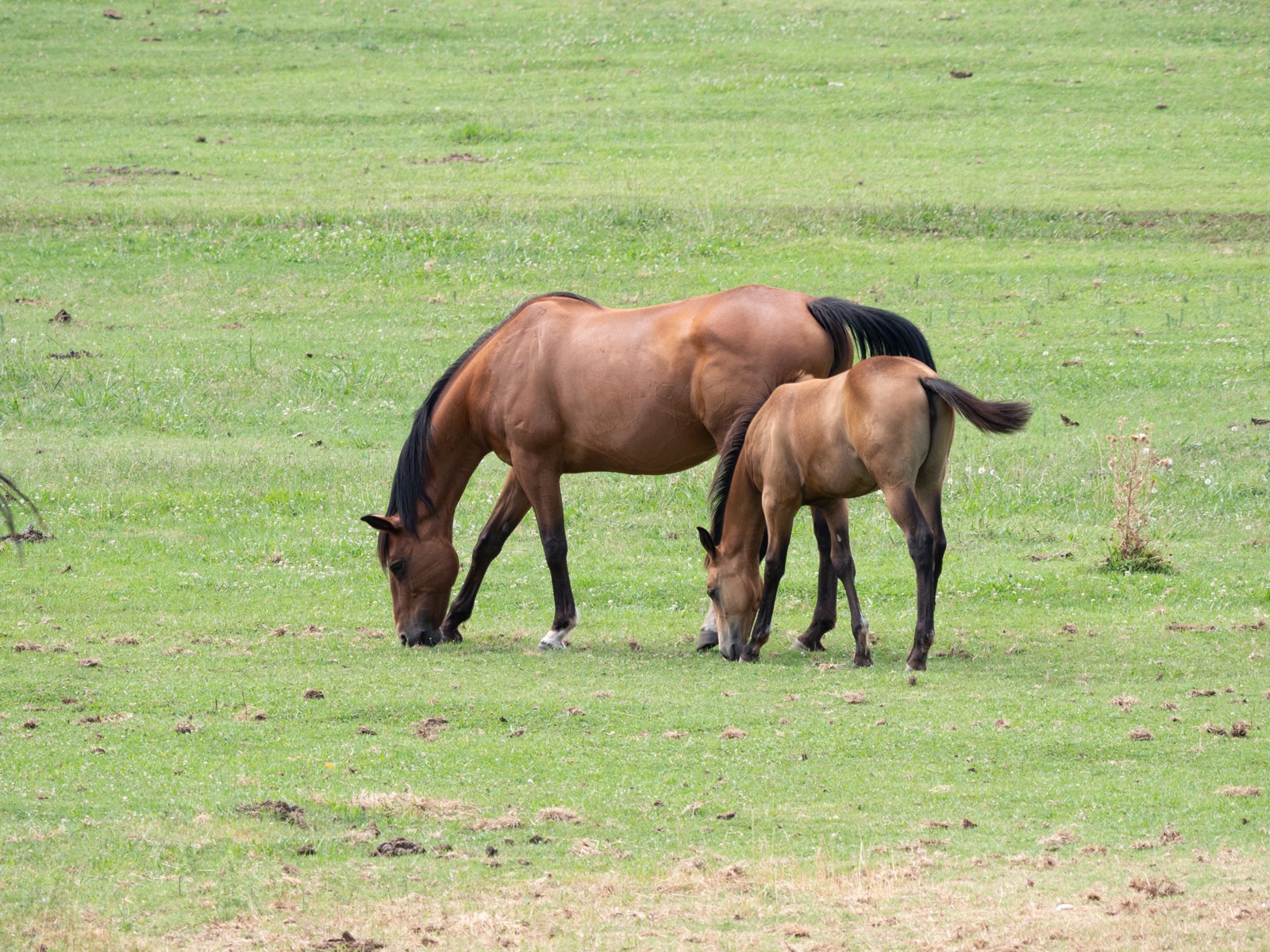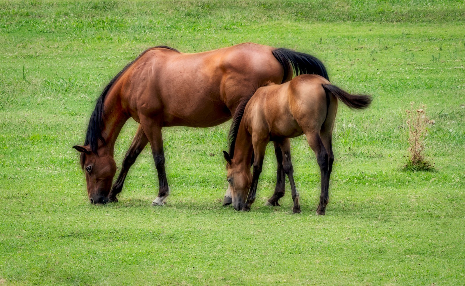 Riding down the road I passed a horse farm with some well cared for stock. I quickly pulled over to see what interactions I could capture. This mare and her foal were nibbling on the grasses. I enjoy how the foal was following along in perfect step and behavior with mom.