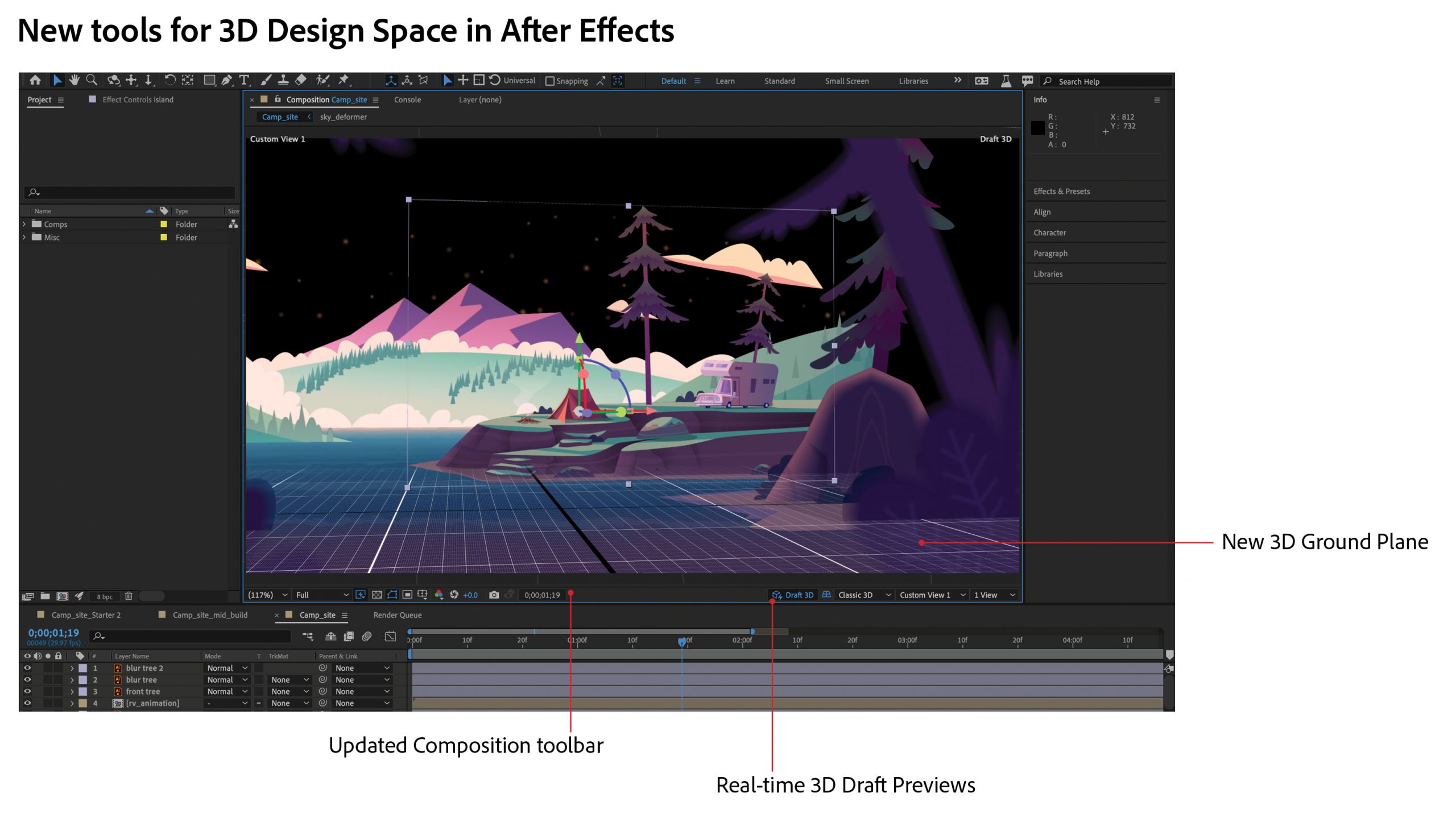 Coming to the After Effects release version is a new real-time 3D Draft Preview, giving users immediate feedback on 3D designs in the Comp panel. There’s also a 3D Ground Plane, helping designers orient their designs in space, providing a horizon line, vanishing point and grid.
