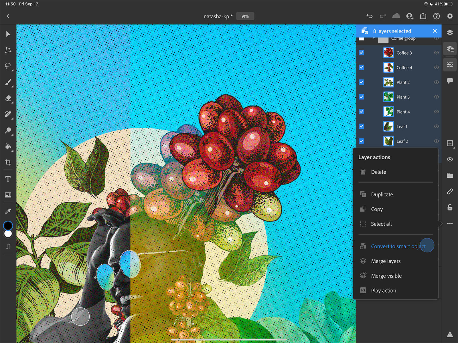 Smart Objects on iPad have the same properties as they do in Photoshop on desktop. You can perform actions, like transform non-destructively, without changing or losing your pixels. You can also convert any Smart Object back to its component layers.