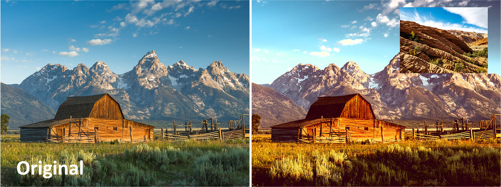 Adjust the season of a scene by creating winterscape from a sunny summer day, or change the leaves on trees from summery green to autumn colors. Alter the time of day of a landscape by giving your mid-day photo a golden-hour sunset.
