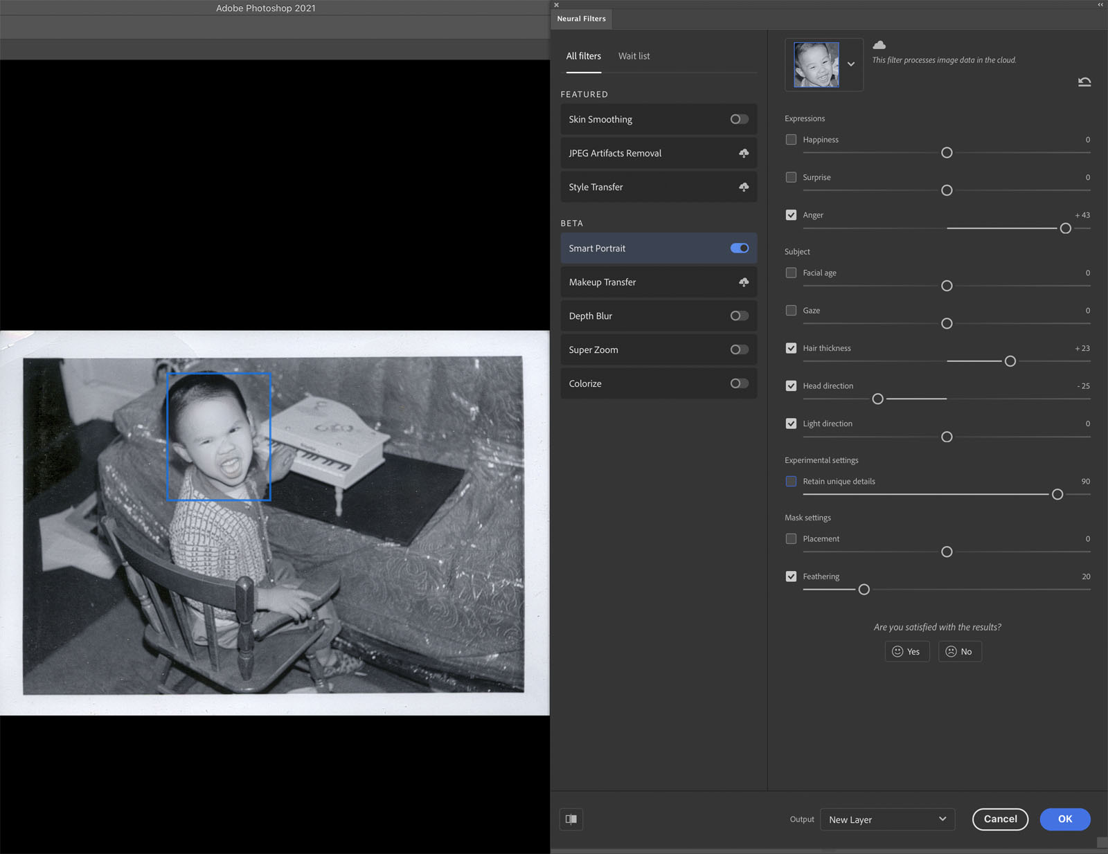 Adobe Photoshop has a number of Neural Filters in their more recent updates. These are not fully developed. However, they allow you to experiment while they gather information for machine learning. I gave it a go. Could I take obvious joy and make it seem the opposite? If I could do this so easily, what else could I do?