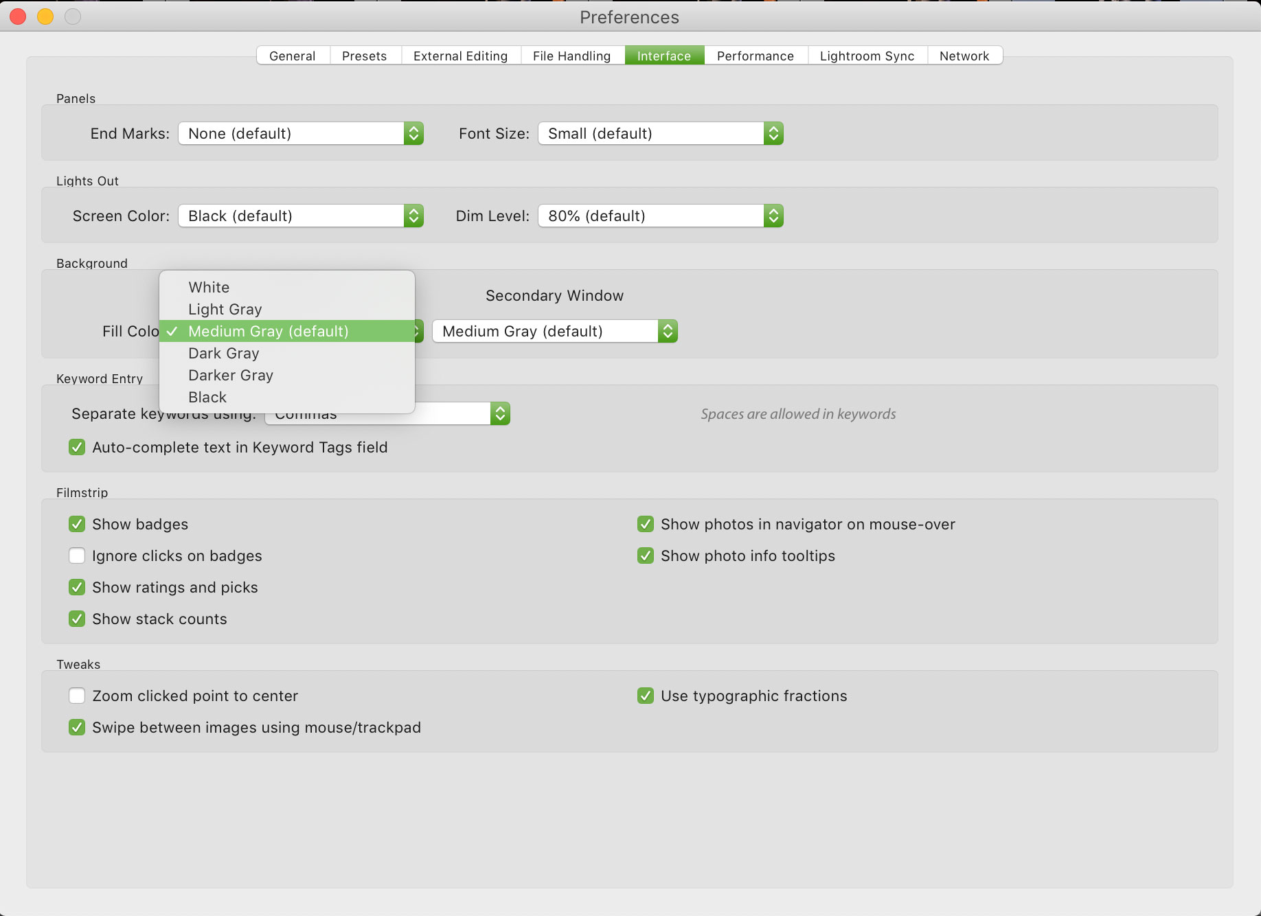Want to switch out the background color in Lightroom? It’s easy. Select Lightroom CC > Preferences from the top toolbar (or on Windows, go to Edit > Preferences), and then click on the Interface tab. Once there, you’ll see a Background area where you can switch the color for the main and secondary windows to one of six options — white, light gray, medium gray (default), dark gray, darker gray and black.