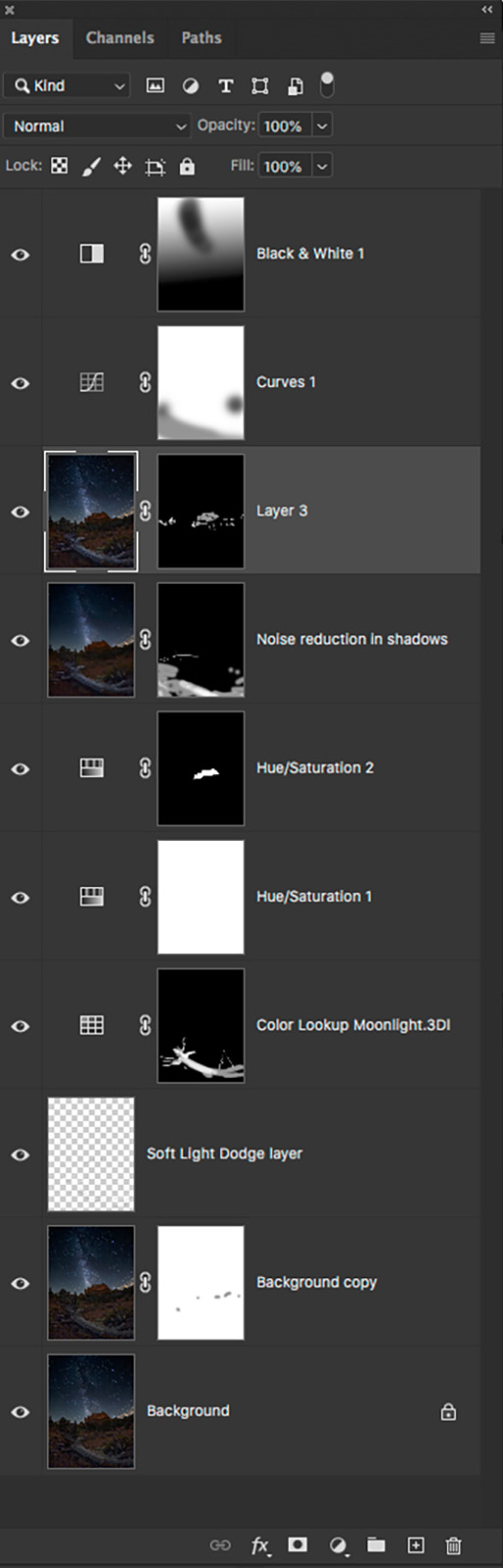 You can see my Layers palette below to get an idea of how I finish off a photo. Some highlights include color grading, enhancing the Milky Way and adding some moonlight to the scene.