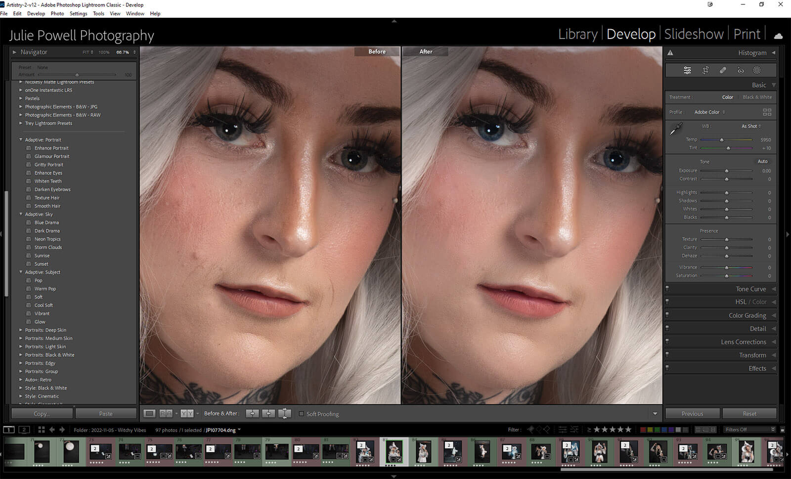 Once you select a mask they can each be edited as you wish, although they have already had some adjustments applied when the preset was selected. You can increase or decrease the slider for the various areas. In the above image, I have the comparison from before and after the Glamour Portrait presets was applied.
