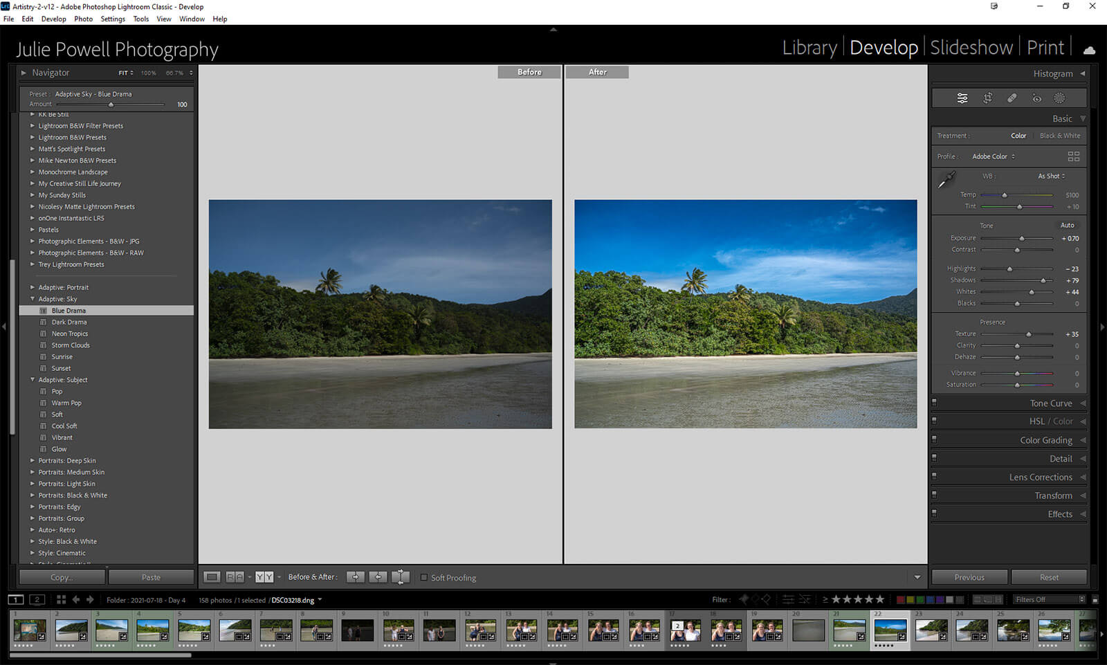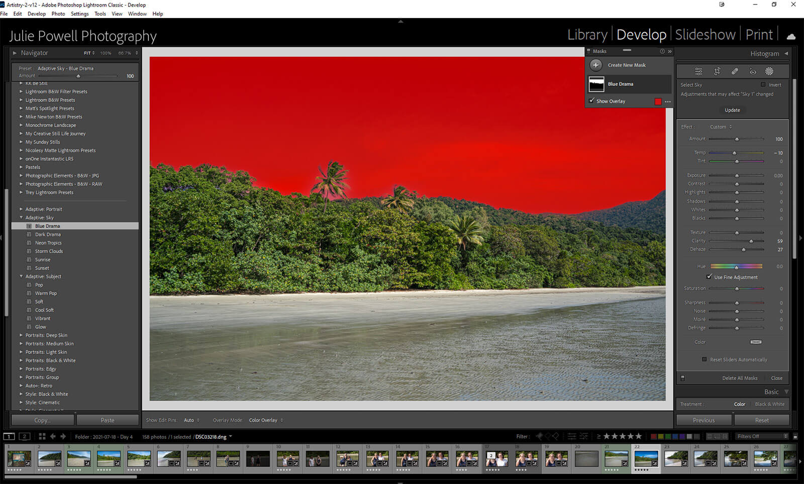 The Adaptive Sky presets do exactly what the name implies, creating a mask for the sky only. Then it applies a variety of effects and sliders to create drama, or color pop, and color shifts. Of course, you could just do your own with a Select Sky mask and a few tweaks of your own. I used the Blue drama in the below image.