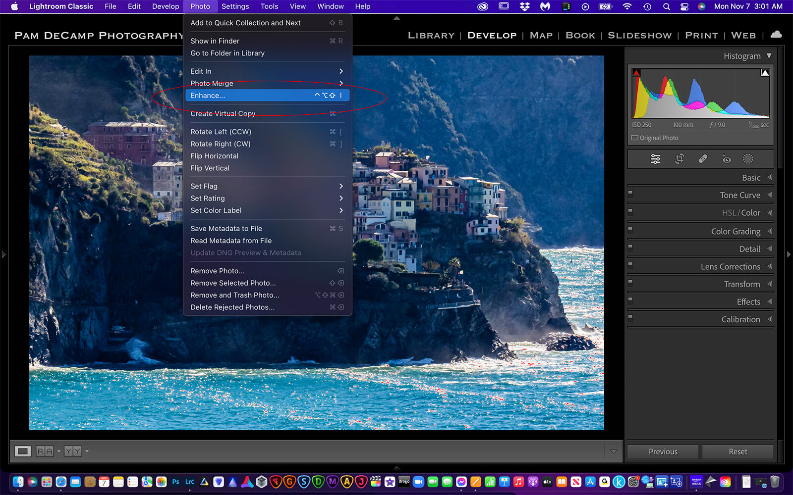 2. In the Develop Module go to the Photo tab and click on Enhance.