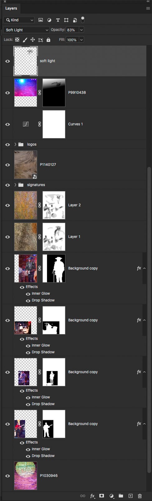 Open a new file. In this case, I am starting with the brick wall with the Sound Bites Grill logo. Drag and drop each entertainer into the new file. Resize and position each appropriately.