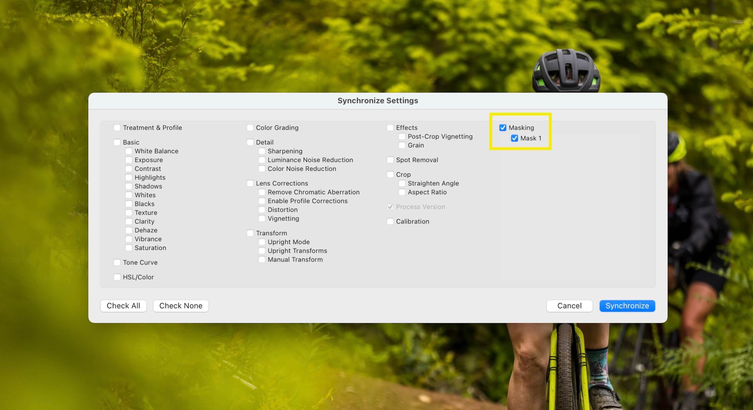 Previously, when you edited a photo and tried to sync the mask to other photos, the mask would copy but the selected subject/sky on each image would not automatically update. This meant that you would still have to click on each photo, go into the masks panel and click Update Subject or Update Sky. Then, once the mask was updated, the masking edits would be applied.