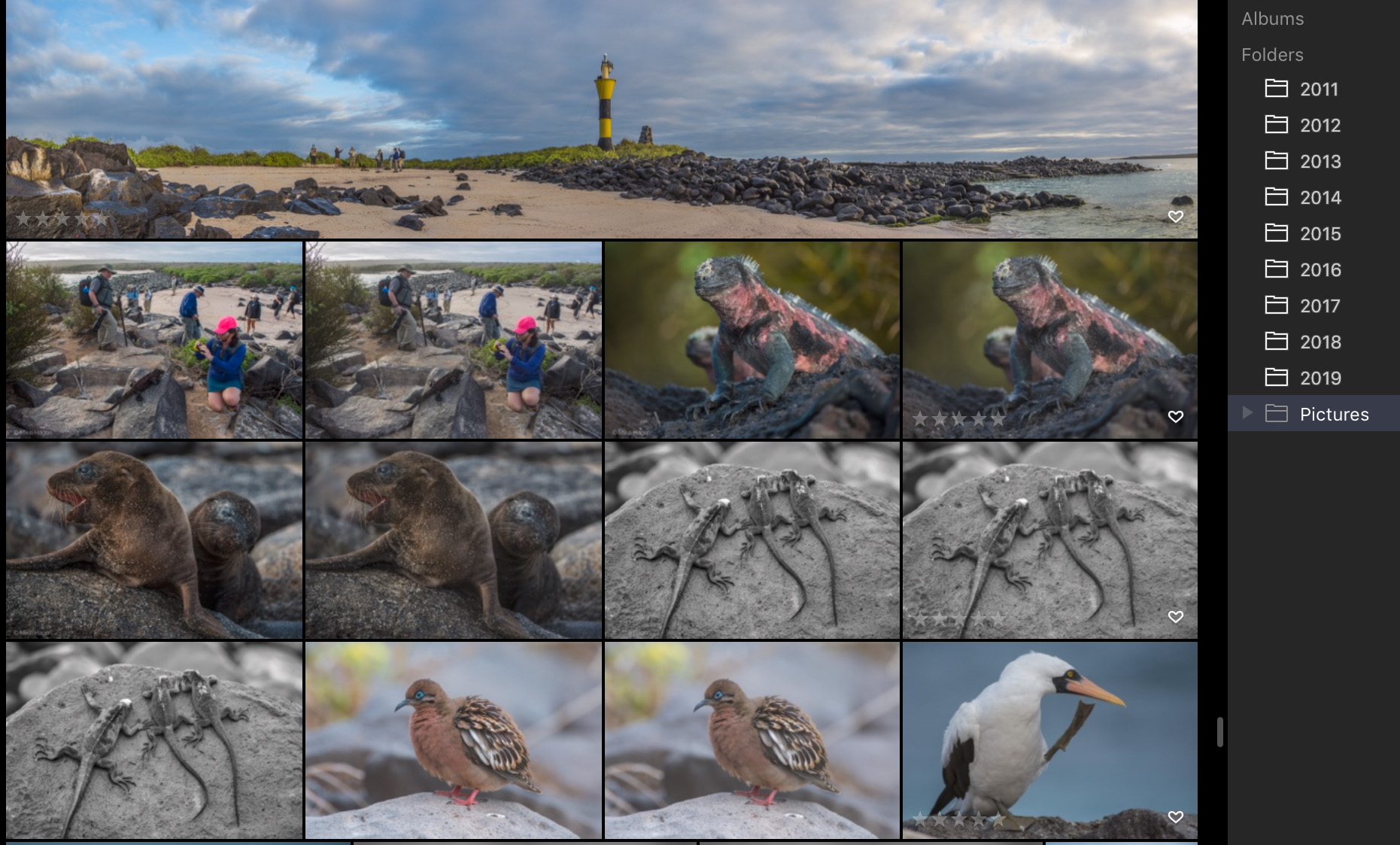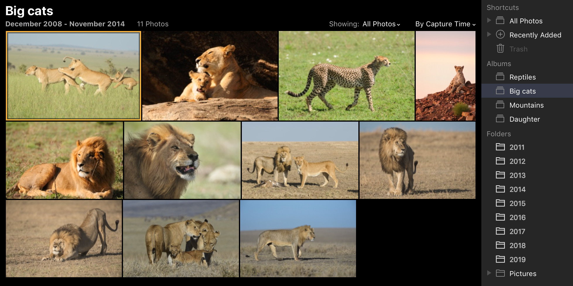 Albums on the other hand are virtual organizational tools that allow you to add images from any folder into a common group. For example, you could create an album of images of your daughter where the images were from multiple years. Or, you could create an album of big cats from different wildlife safaris. This functionality is almost identical to collections in Lightroom.