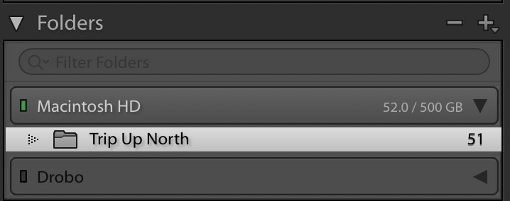 Then, again, I would drag that folder over to my Drobo device through the Lightroom interface, so the photos from my trip could be stored with the rest of my catalog’s photos.