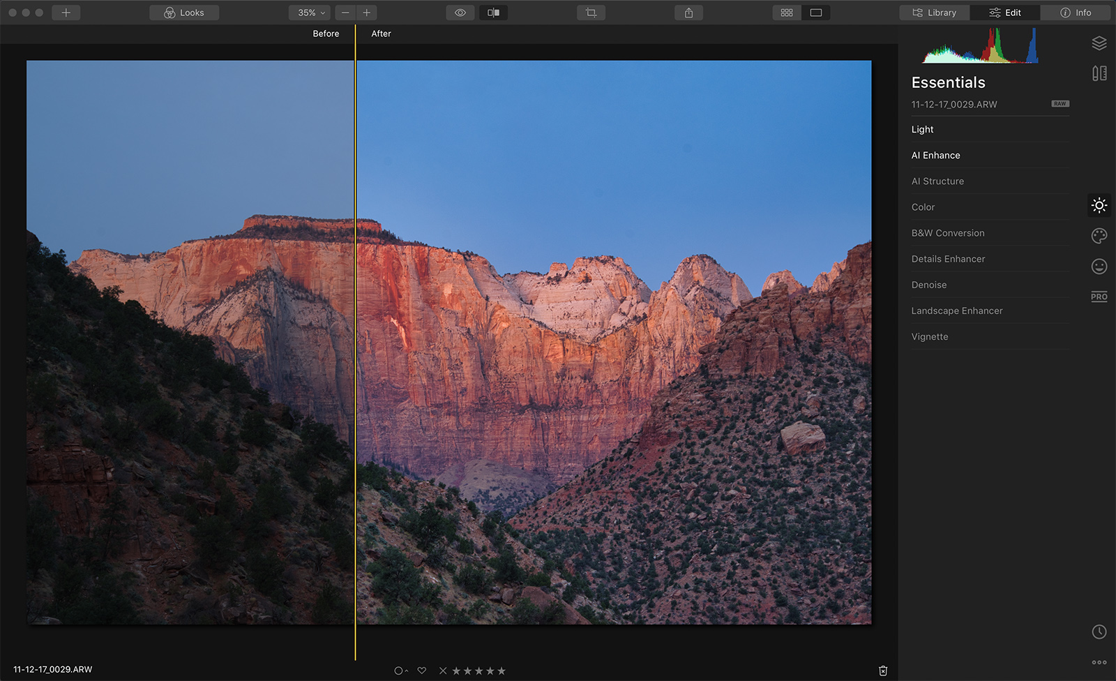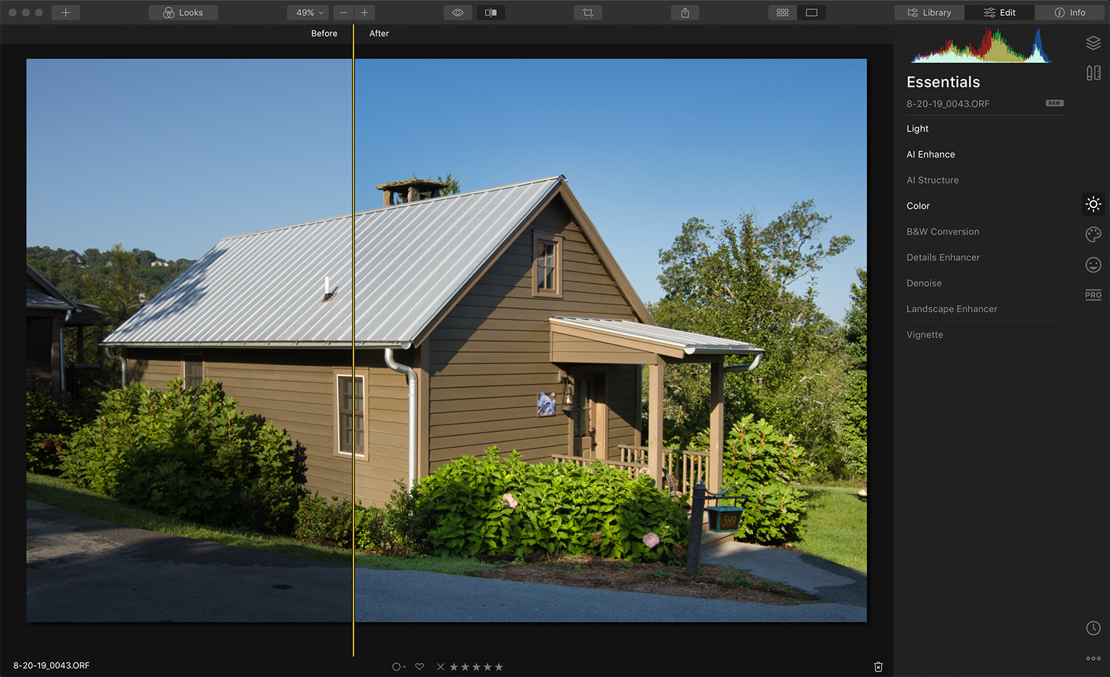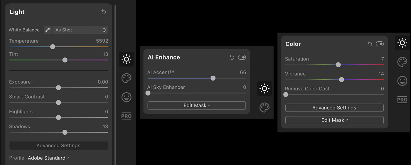 I used three tools, all in the Essentials tab. Using the Light tool, I changed the color profile to Adobe Standard and brightened my shadows. Using AI Enhance with the AI Accent slider helped even more by bringing out more shadow detail while improving color and contrast. Lastly, I used the Color tool to slightly increase Saturation and Vibrance.