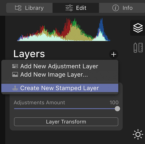 Next up is sky replacement. But before I do that I like to create a new Stamped Layer, as seen above. Click on the Layers tab, then the + icon and choose Create New Stamped Layer.