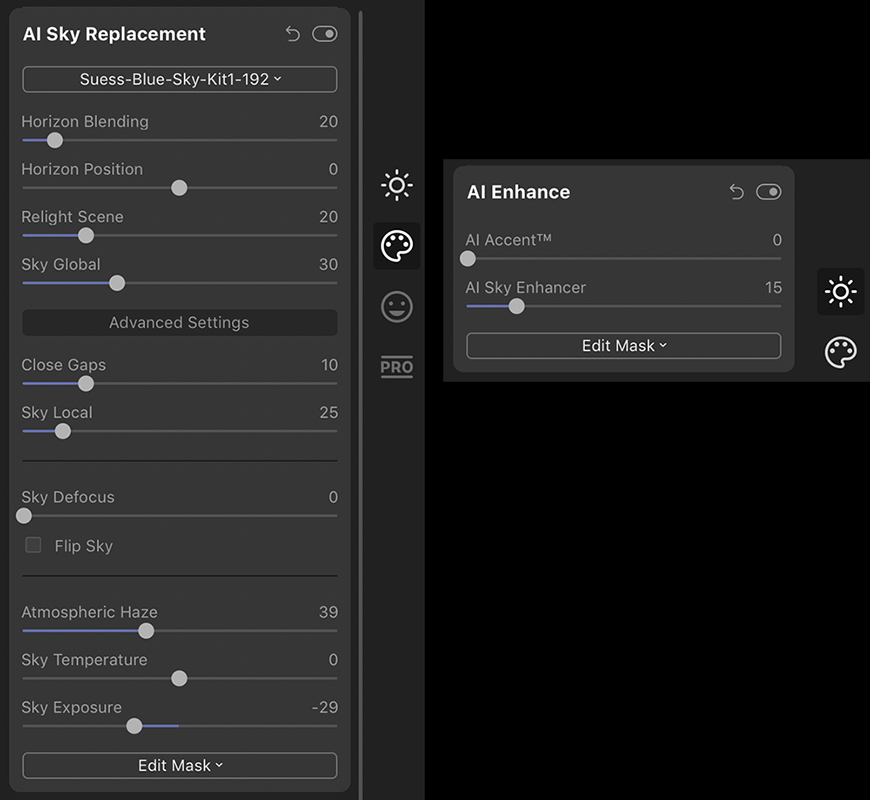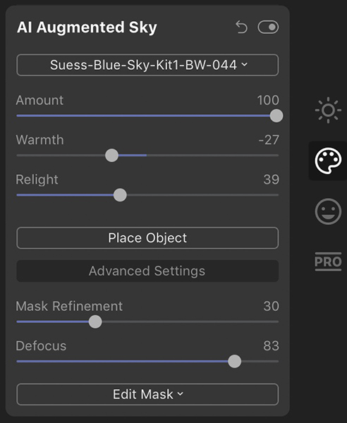 The settings I used in the AI Sky Replacement tool are above, using a sky from my Blue Sky Clouds Kit 1. Almost all the settings were at the default, with the exception of the Atmospheric Haze slider, which I increased to add more haze and make the results more believable. I recommend always taking a look at this slider when doing your own sky replacements.