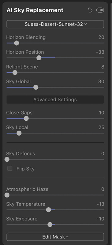 Using a sky from my Desert Sunset Kit, you’ll notice I made some slight adjustments to the Horizon Position (to adjust the placement of the sky), the Relight Scene (very slight adjustment to better balance the new sky and foreground), as well as slight adjustments to Sky Temperature and Sky Exposure.