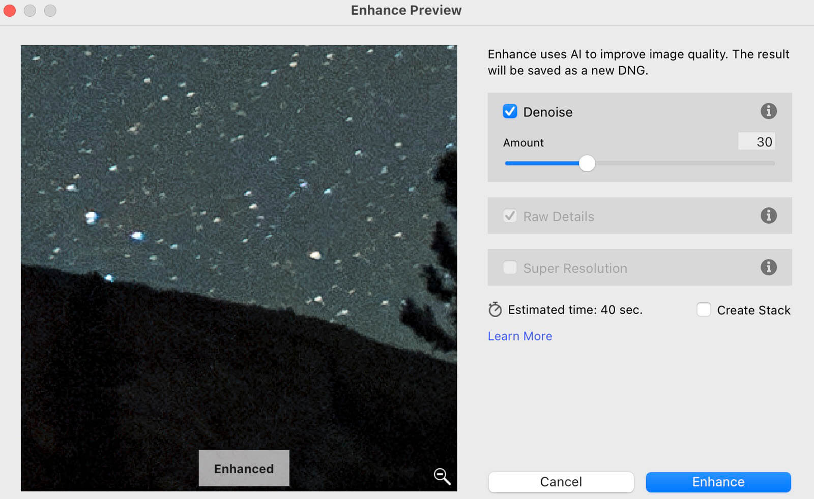 Step 4. Click enhance to process the image to a new DNG file. The file will have “Enhance-NR” appended to it. And Lightroom will of course place it next to the original source image.