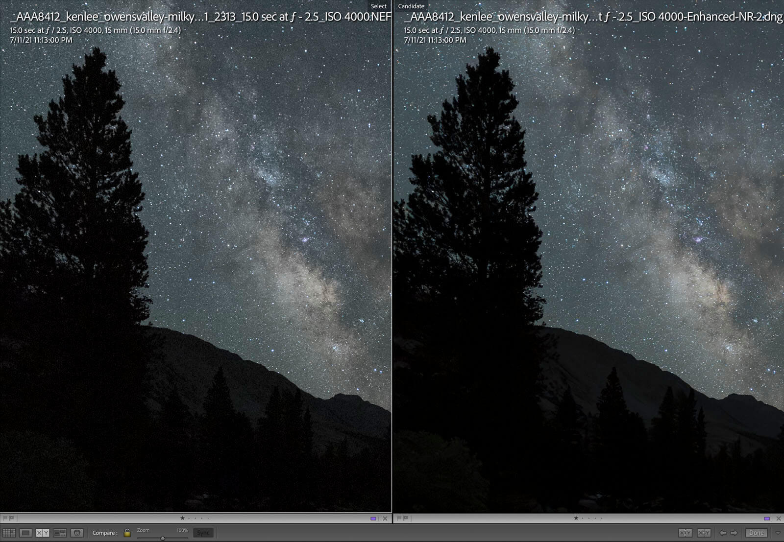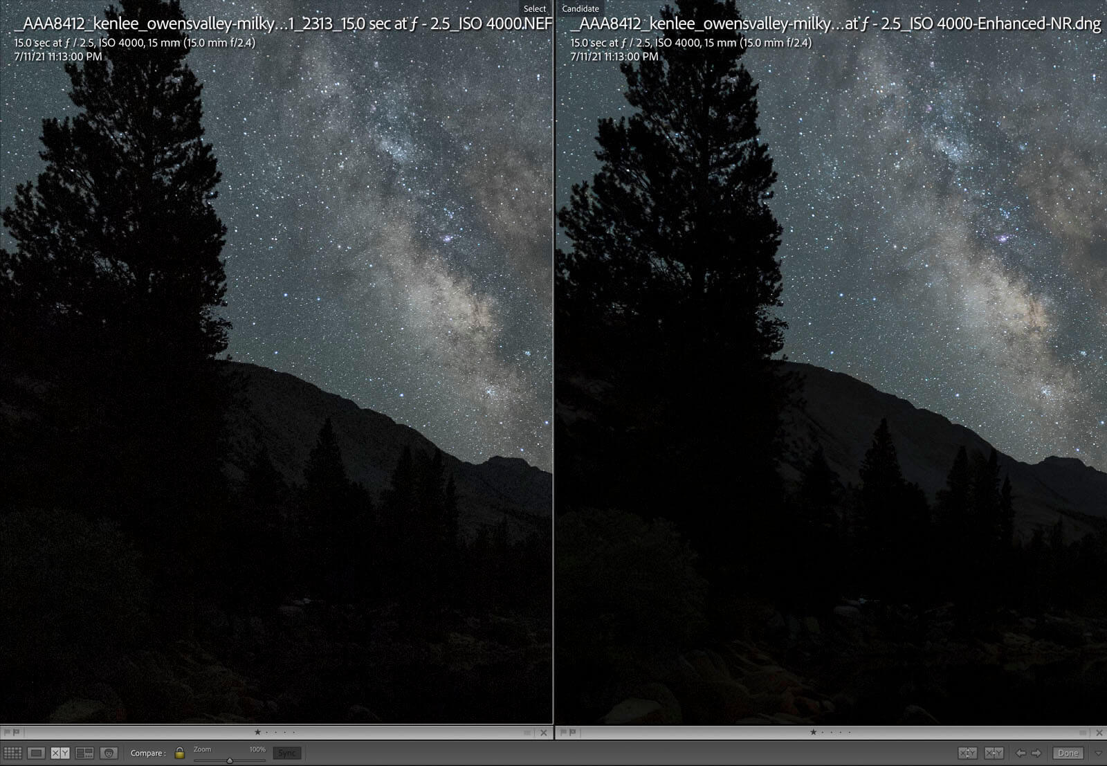 I compared a single exposure photo of the Milky Way in the Sierra Nevada Mountains. I used a Nikon D750 with an Irix 15mm f/2.4 prime lens.