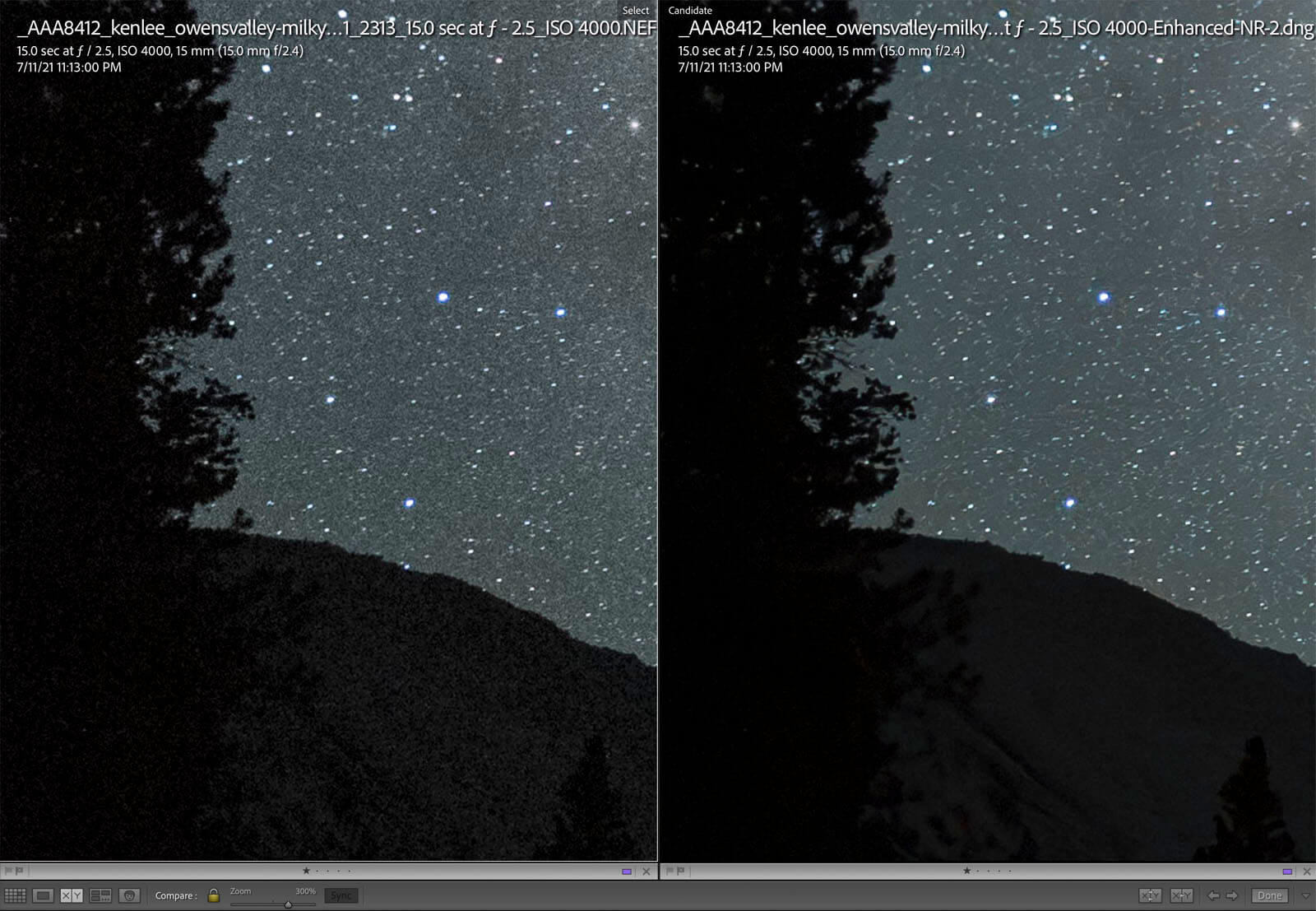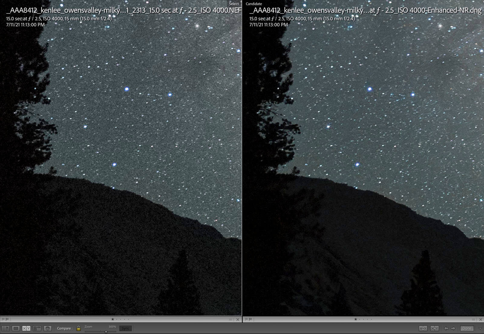 The feature also addressed color noise — the little spots of noise that are easily visible in the sky — while leaving the stars alone.