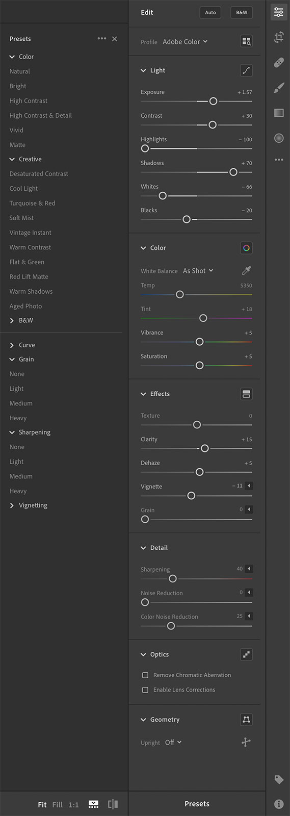 For the most part, the editing tools that you’re used to from Lightroom Classic are all here and work pretty much the same way. There are some options hidden behind buttons — Split Toning and the Color Mixer, for instance — but in terms of an editing tool, Lightroom is very close to Lightroom Classic. Presets are there too, albeit they show in a different location that takes some getting used to. Finally, camera and Adobe profiles are present in an interface very similar to Lightroom Classic’s.