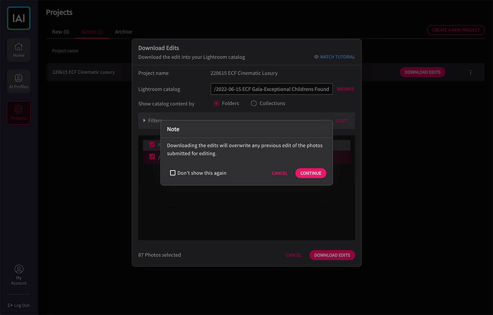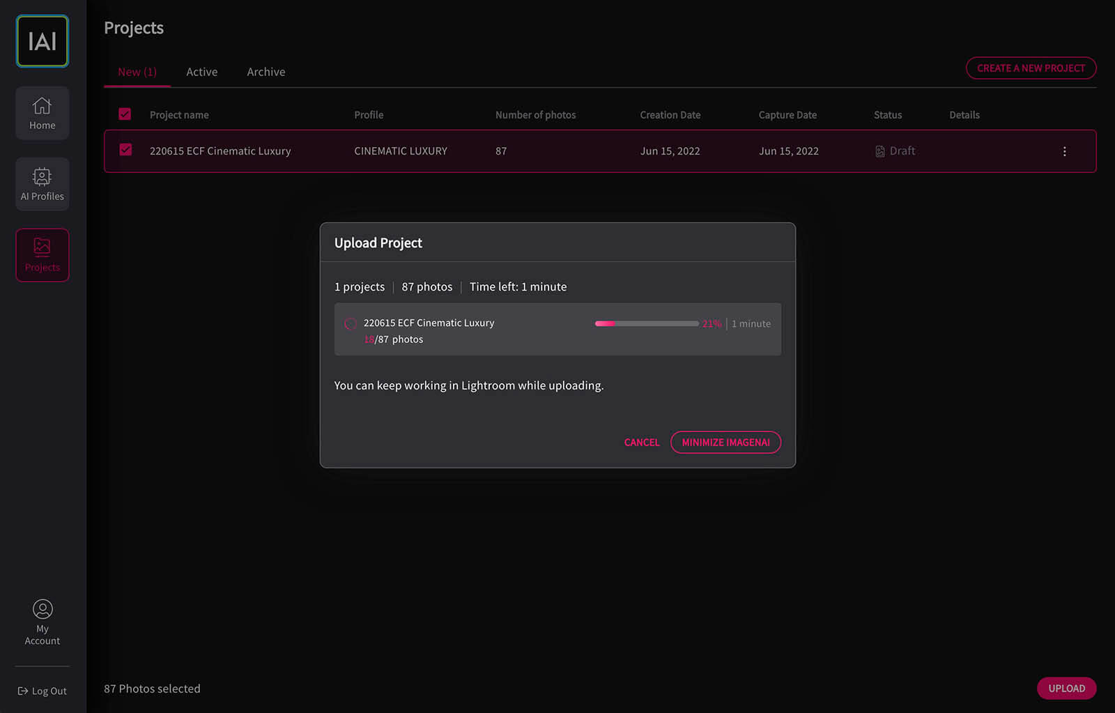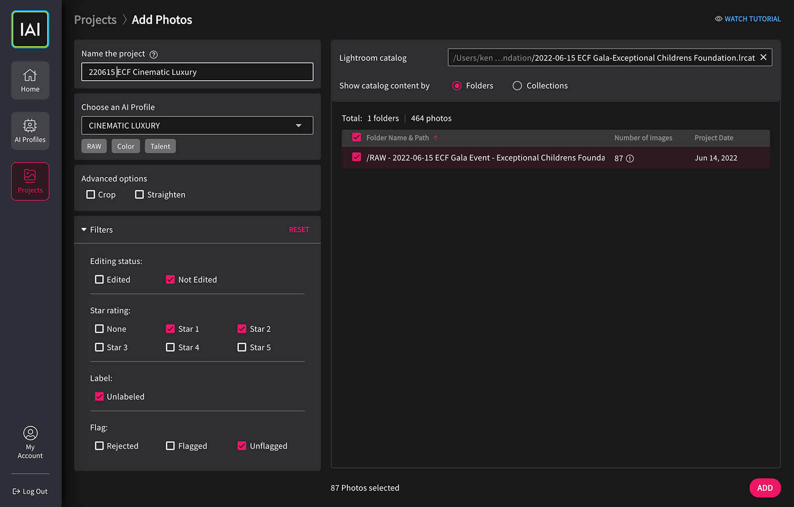 Then I simply used the profile. Imagen was ridiculously easy to use. I had already “starred” the photos that I wanted processed in Lightroom after creating a catalog specifically for the gala fundraiser photos. I just simply uploaded them.