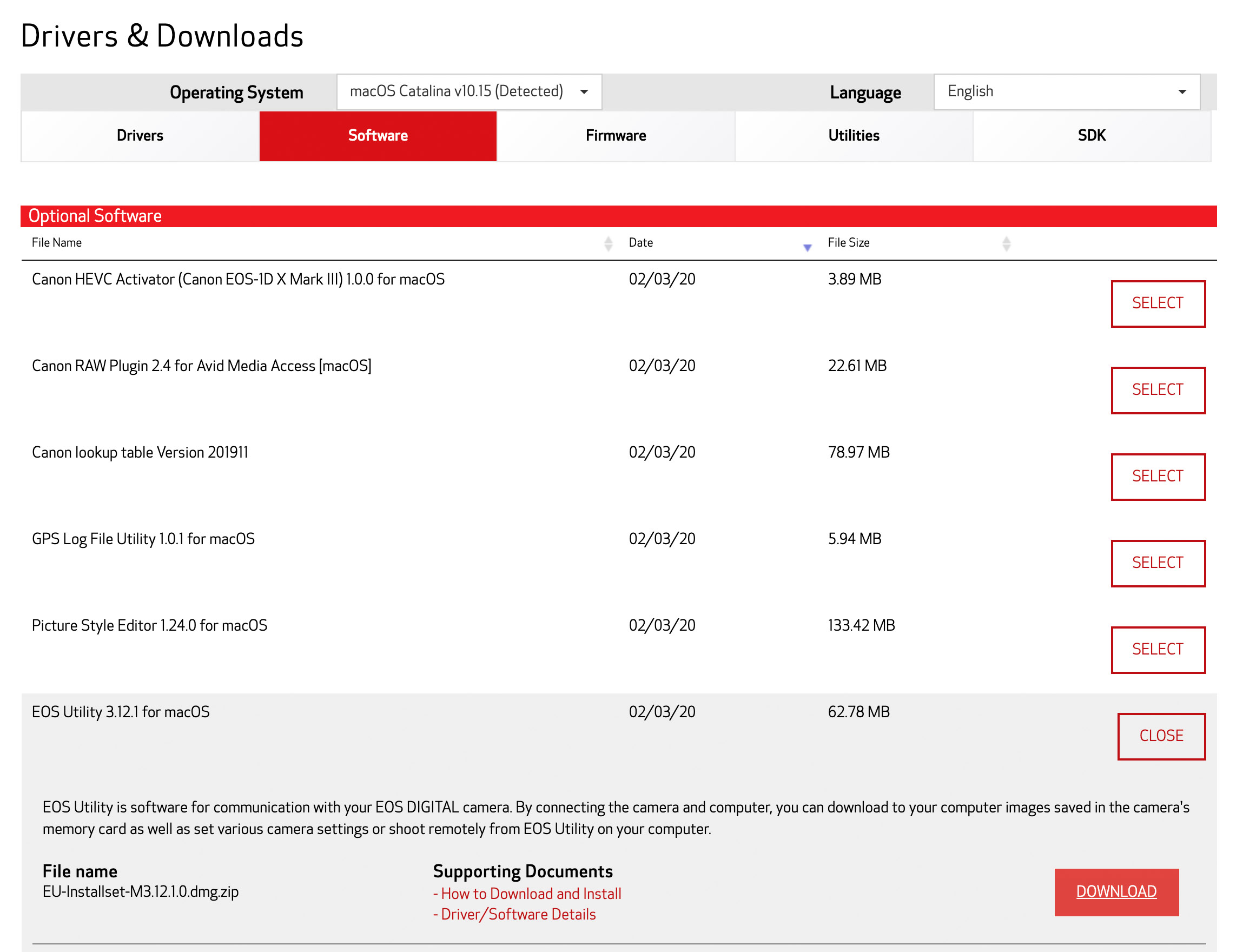 Scroll down to the EOS Utility 3.12.1 for macOS, then click Select.