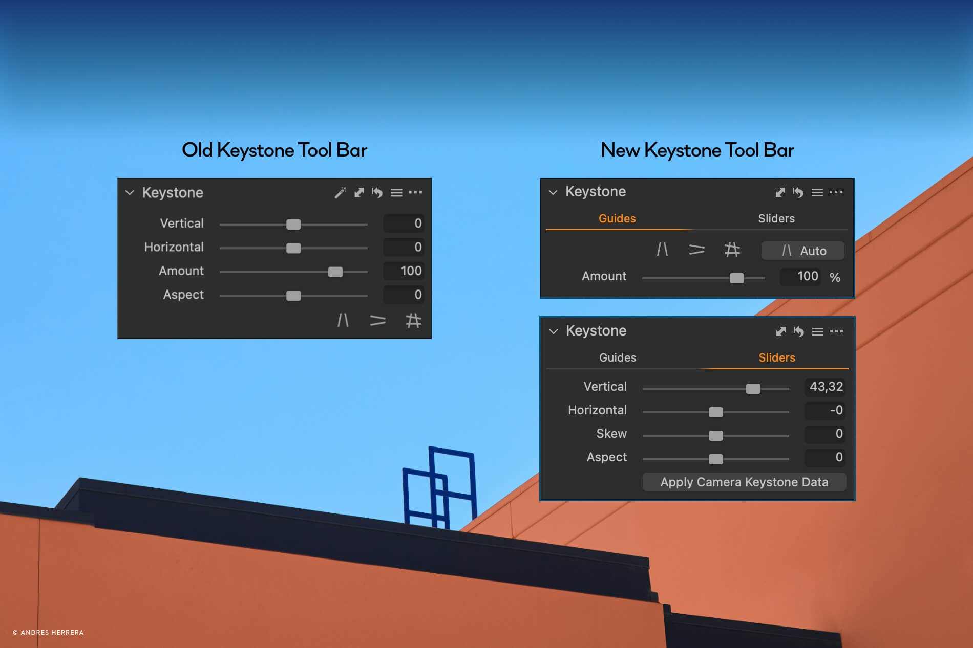 The Keystone Tool has been redesigned with new functionality and a new user interface. The tool is now split into two tabs, Guides and Sliders, making it easy to automatically apply corrections and as well as manually tweak the result afterwards, and Auto Keystone has been added for all camera models, allowing a swift and precise perspective correction of most images.