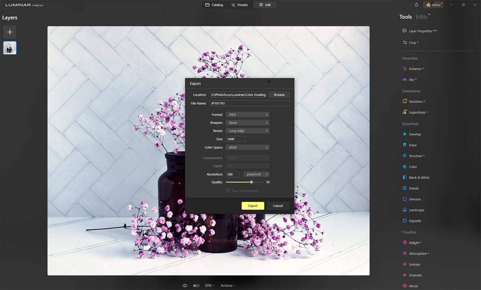 Once you’re happy with your color grading, you can save your image. Luminar Neo allows you to save your image in a variety of formats, including JPEG, PNG, TIFF, and more. You can also choose the quality of your image and the file size.
