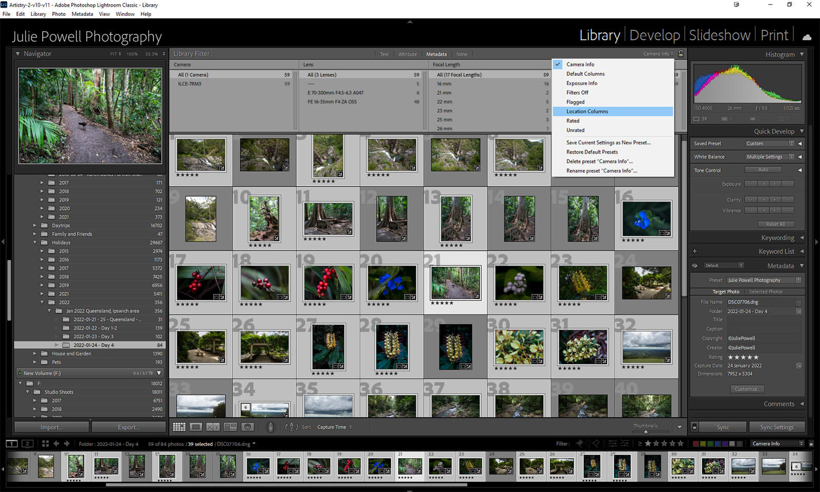 You can actually sort through your own files using the metadata. Want to see how far your technique has developed just using a 50mm lens? You can search for lens type or any other descriptor in the Metadata tab in the Library module. It’s very handy.