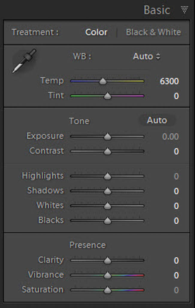 Your first decision is white balance. You can choose to set the white balance to Auto –which would set the tint value to 0– or select a preset from the drop-down list. The choice is yours. I like to keep mine on auto. Set the remaining values to 0.
