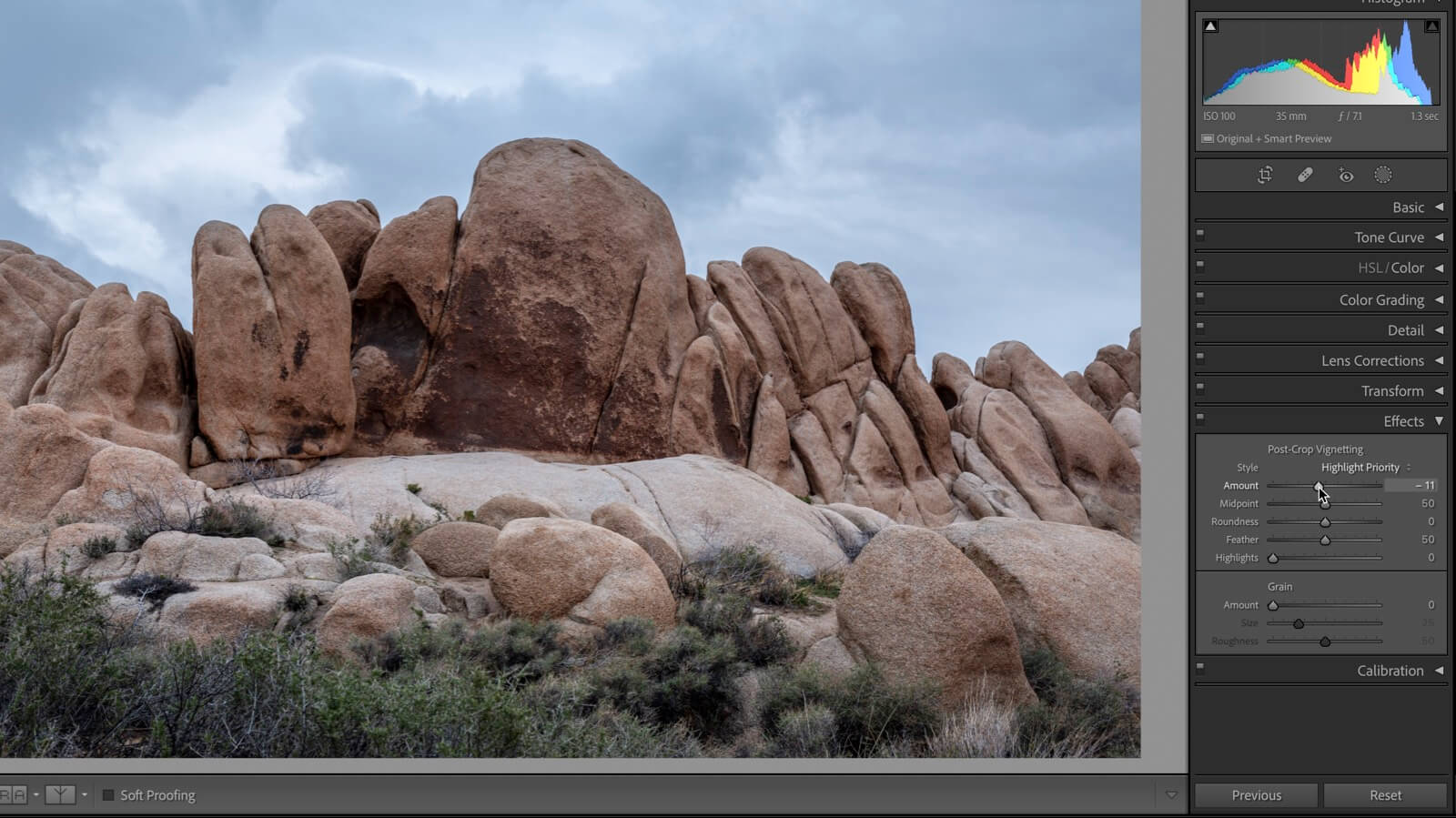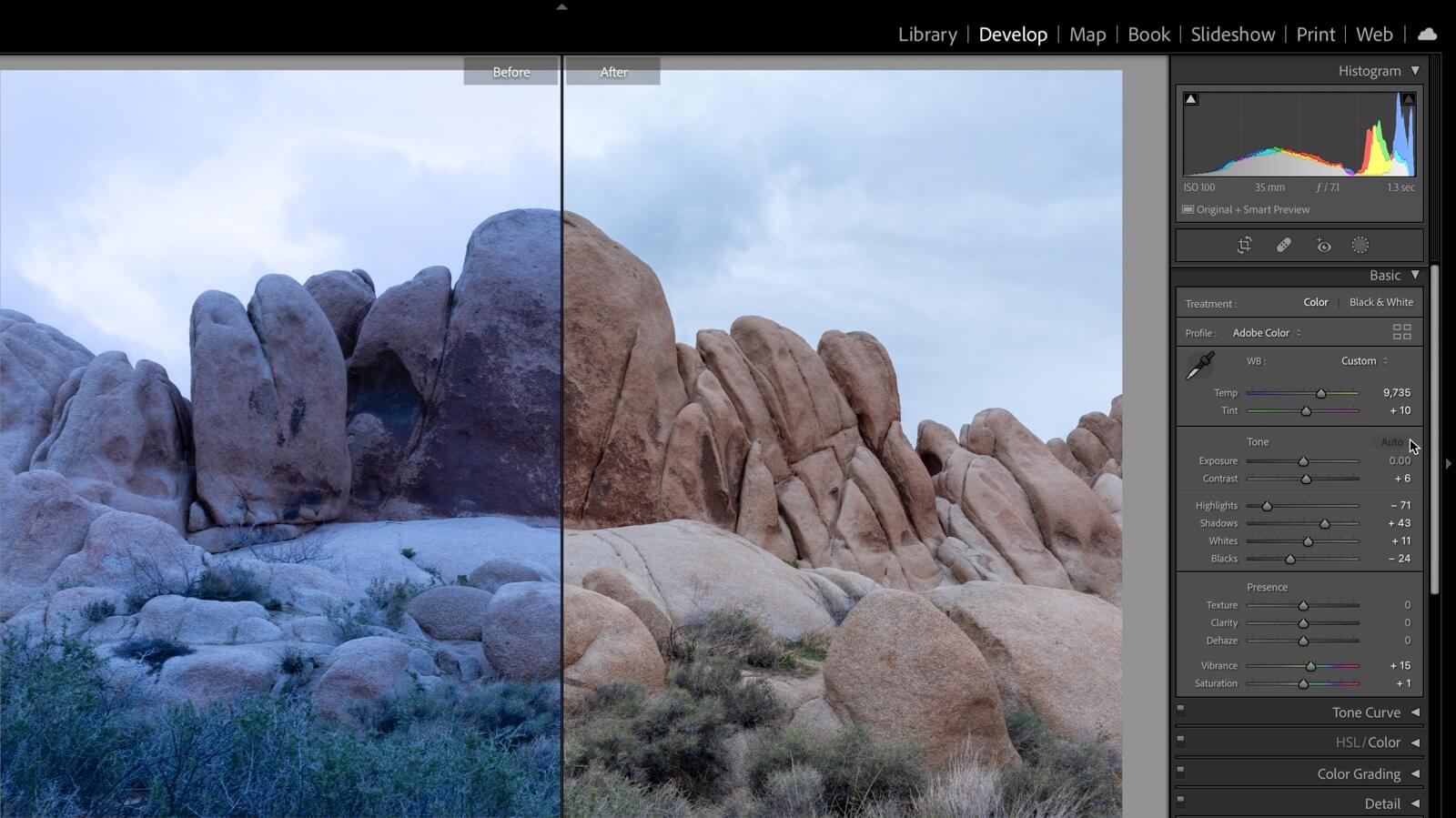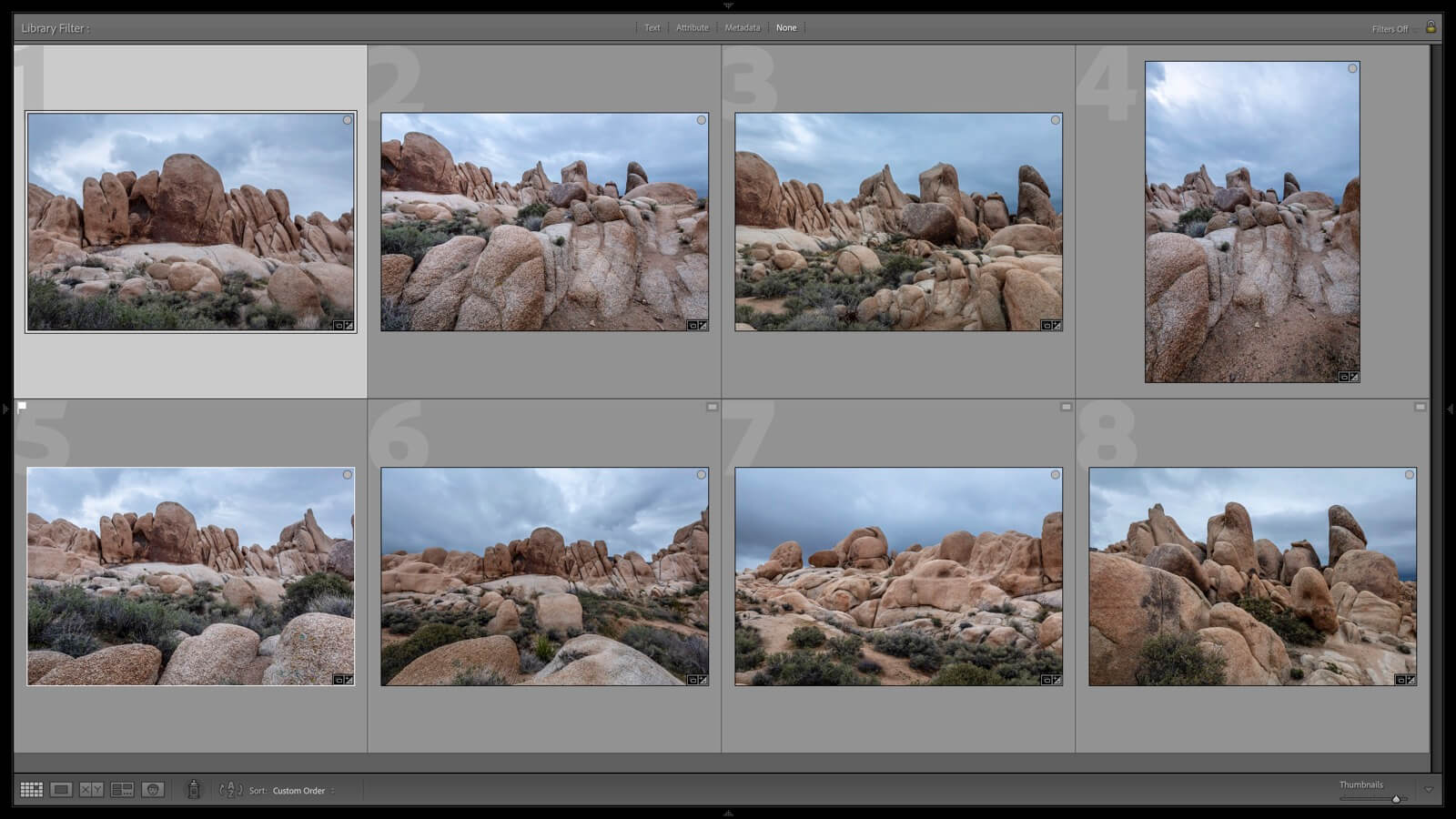 We’ll start with a series of photos that were captured on a cloudy day in Joshua Tree National Park. I failed to check my white balance settings (oops!) when I started shooting in the near-dark early morning, so most images from this session have a cool blue color cast. I want to correct the color, bring out texture in the clouds, and add clarity and contrast to the rocks in the foreground.