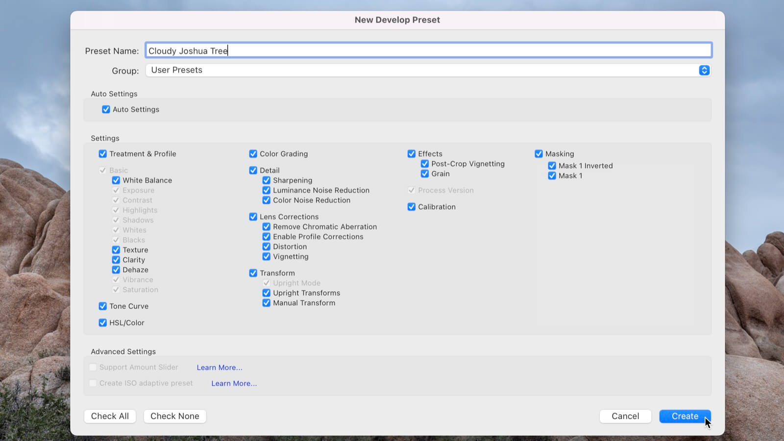 Create a name for your preset, then tick the box for Auto Settings and Masking.