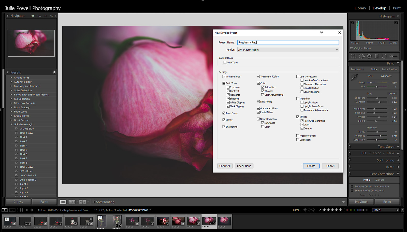 Next, I will do some white balance adjustments and then play with my other sliders, adding or removing contrast, highlights, etc. I work down the list of adjustment panels until I am happy with the result. Then I can create another preset, however, I do not select exposure or anything from the transform tool, as it is possible these may need to be tweaked for each individual image.