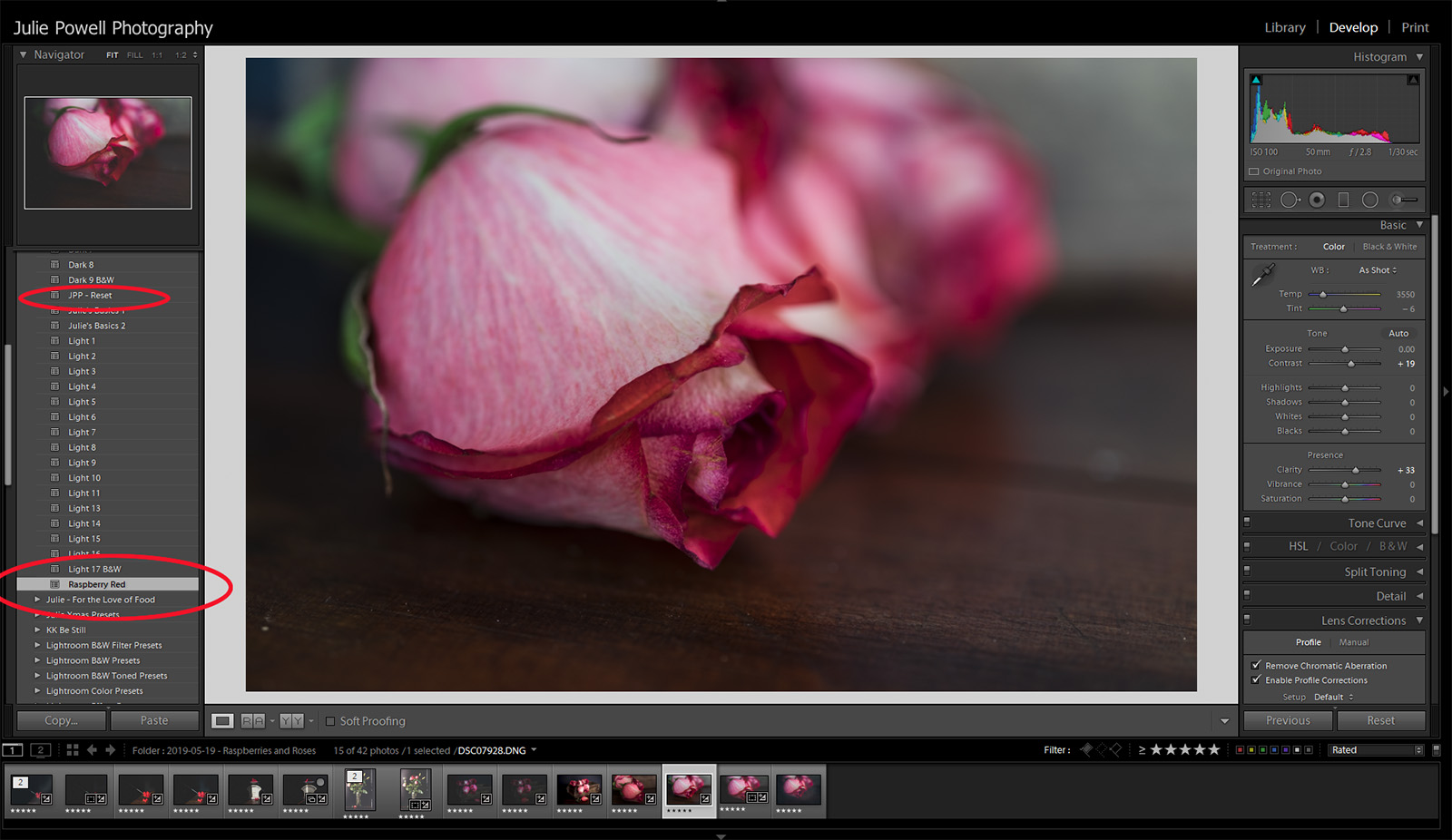 If you don’t like that preset on the image you can use the reset preset you have made, this keeps any crop or exposure you may have previously had.