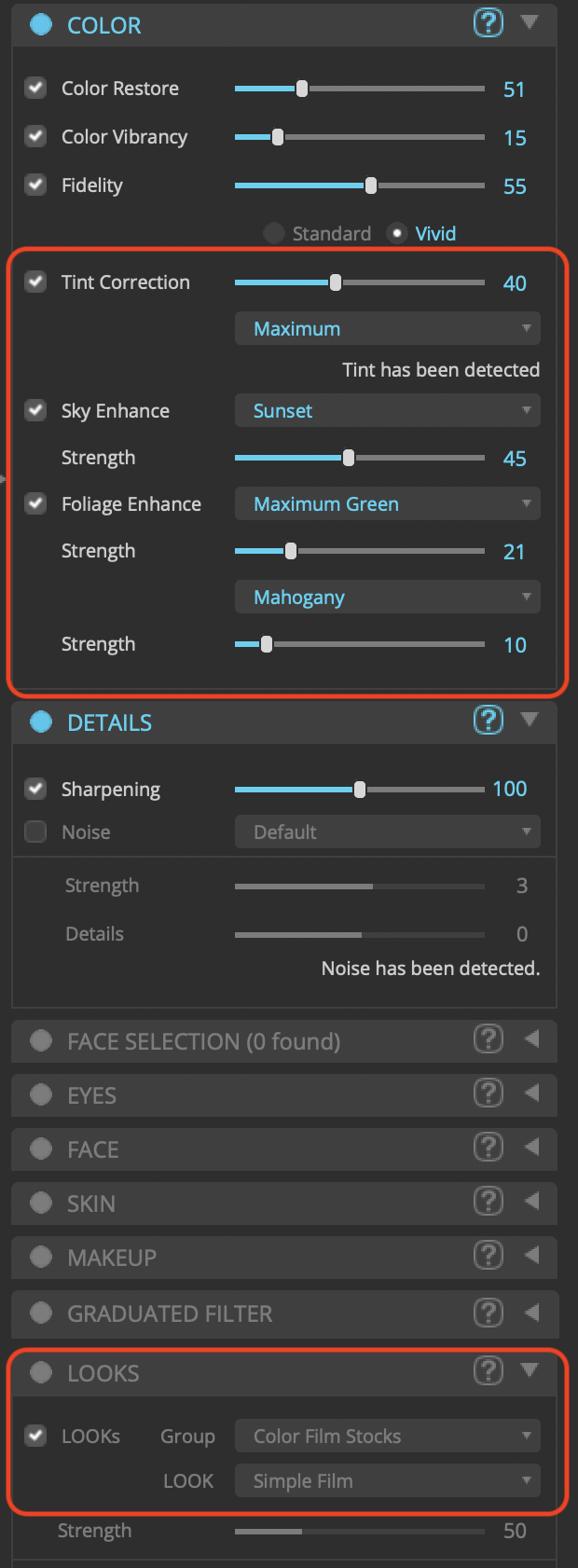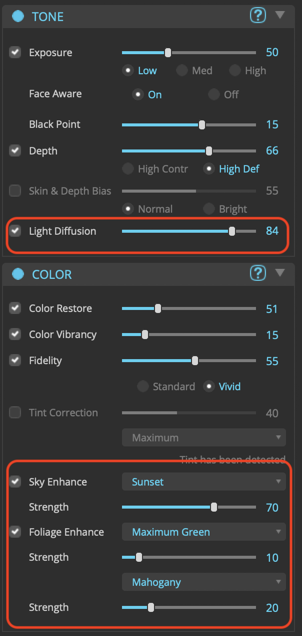 Here are the settings that I changed/fine-tuned to my taste. I turned on Tint Correction. In Foliage Enhance, I Increased Maximum Green and reduced Mahogany. I also turned off Looks.