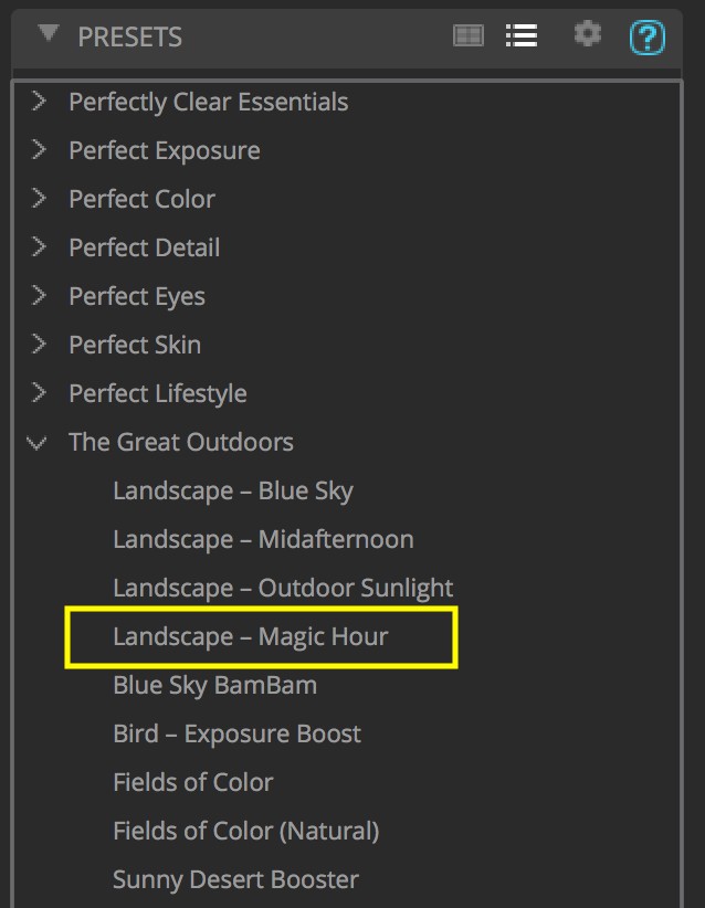 Here are the default settings when you apply the preset Landscape – Magic Hour. The red outlines are specific the Magic Hour look.