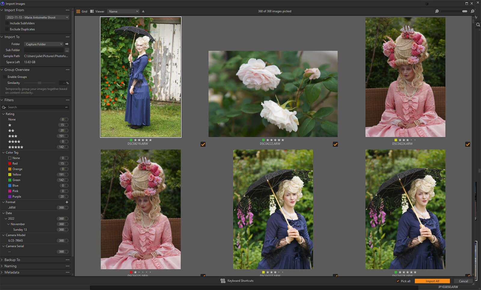 You can still import with the standard Import button, but you can switch between Grid and Viewer mode; rate, star and color code images on import. You can even select Group Overview and enable groups by similarity. Zoom in and check images without waiting for preview.