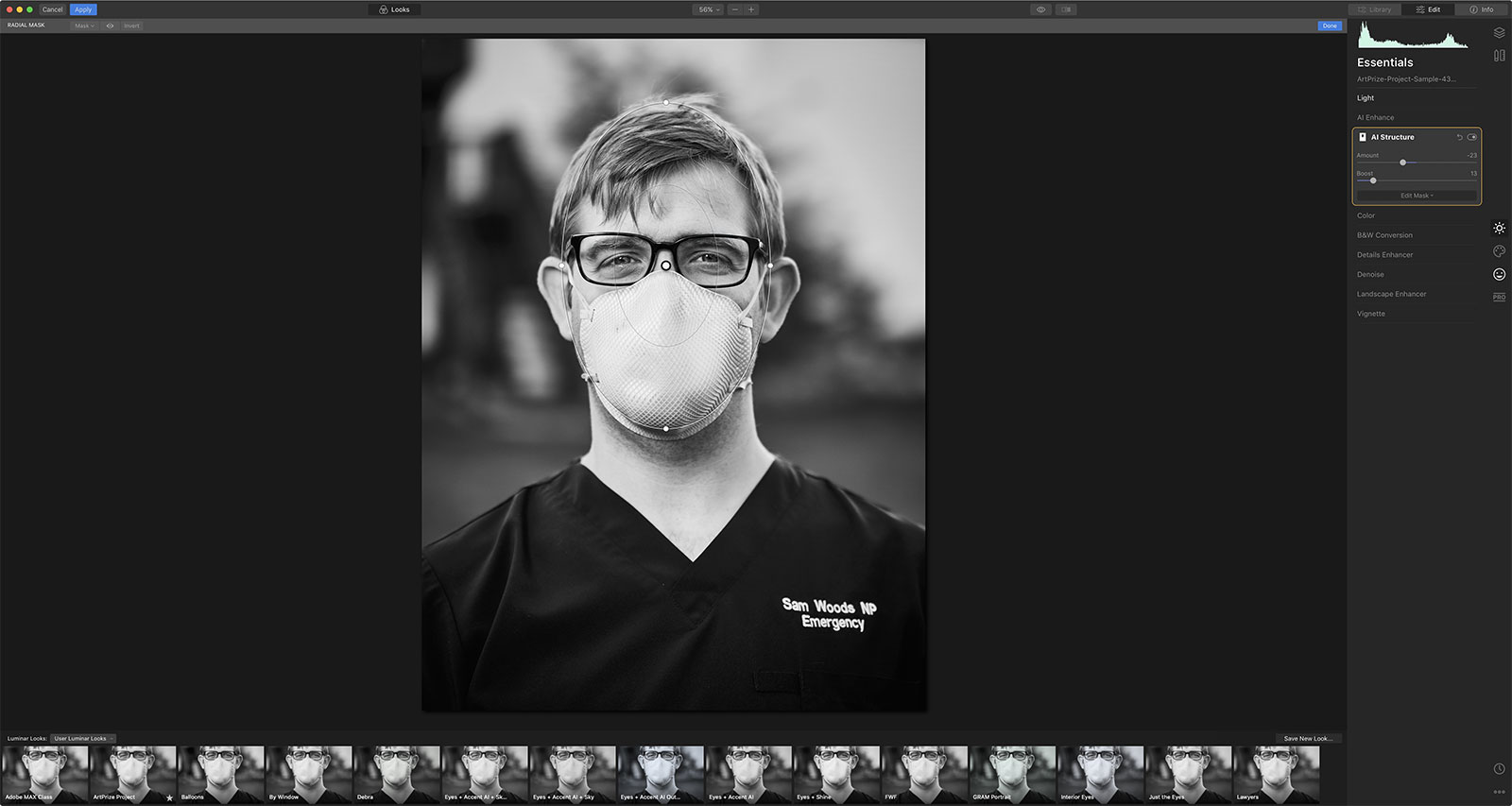 Once here, I used the Smart Contrast slider (in the Light tool) to add a little bit of contrast to the image. Then, I used the AI Structure tool to lessen the detail in my image. Not wanting to take detail away from his face, I clicked on Advanced Settings in the AI Structure tool, and then drew a radial mask around the subject’s face. Then I adjusted the structure slightly.