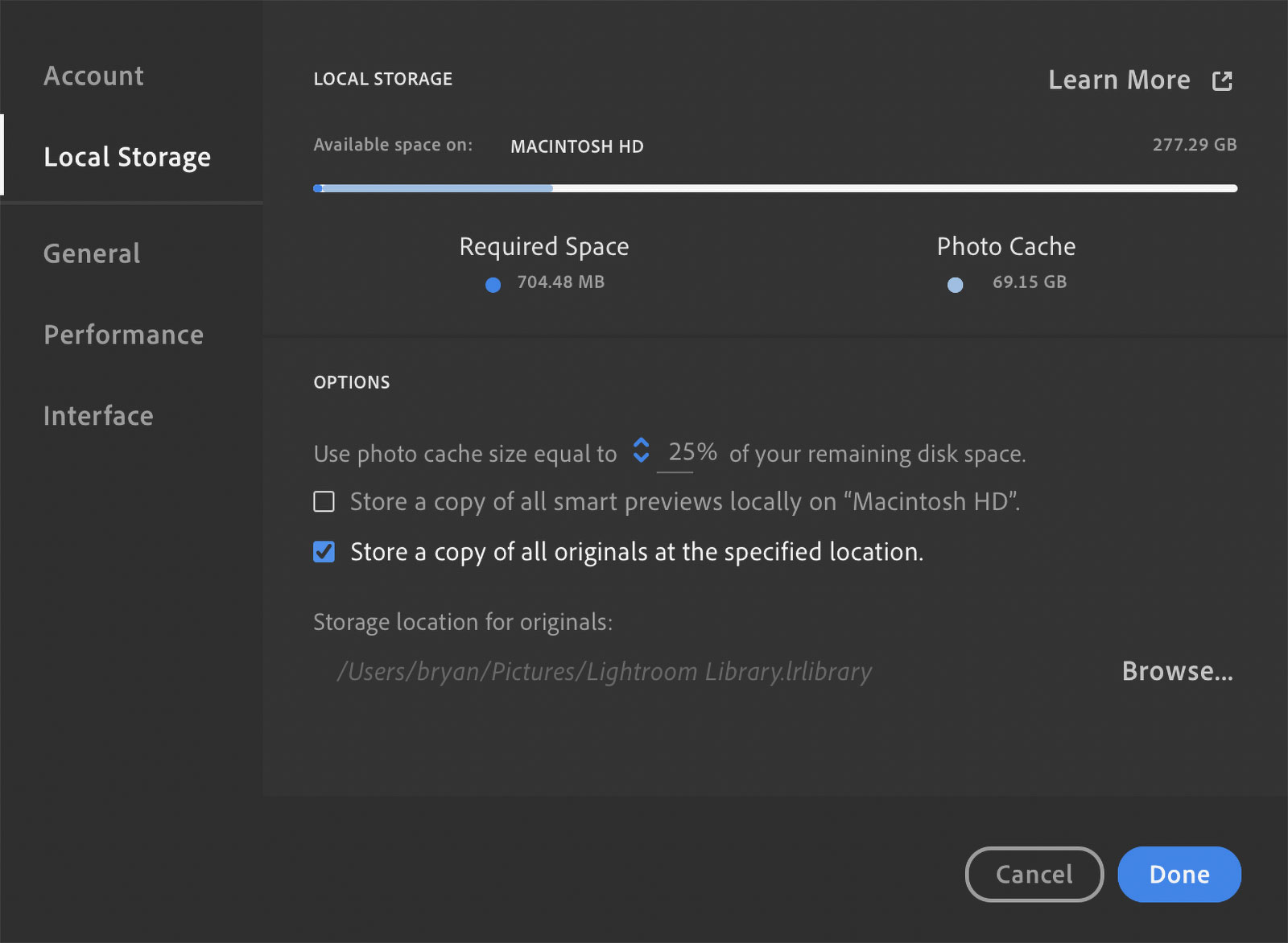 “One of the reasons that we have Classic versus Lightroom is because of these distinctions between use cases and needs. We have options in Lightroom, if you go to Local Storage [in Preferences], we have options. These are in addition to syncing to the cloud. The fundamental kind of truth of your imagery with Lightroom is, in the cloud vs. locally.”