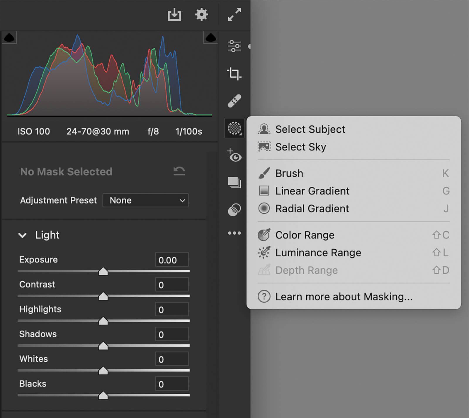 Click and hold it to reveal the masking options: Select Subject, Select Sky, Brush, Linear Gradient, Radial Gradient, Color Range and Luminance Range tools. Choose one of them to get to work.