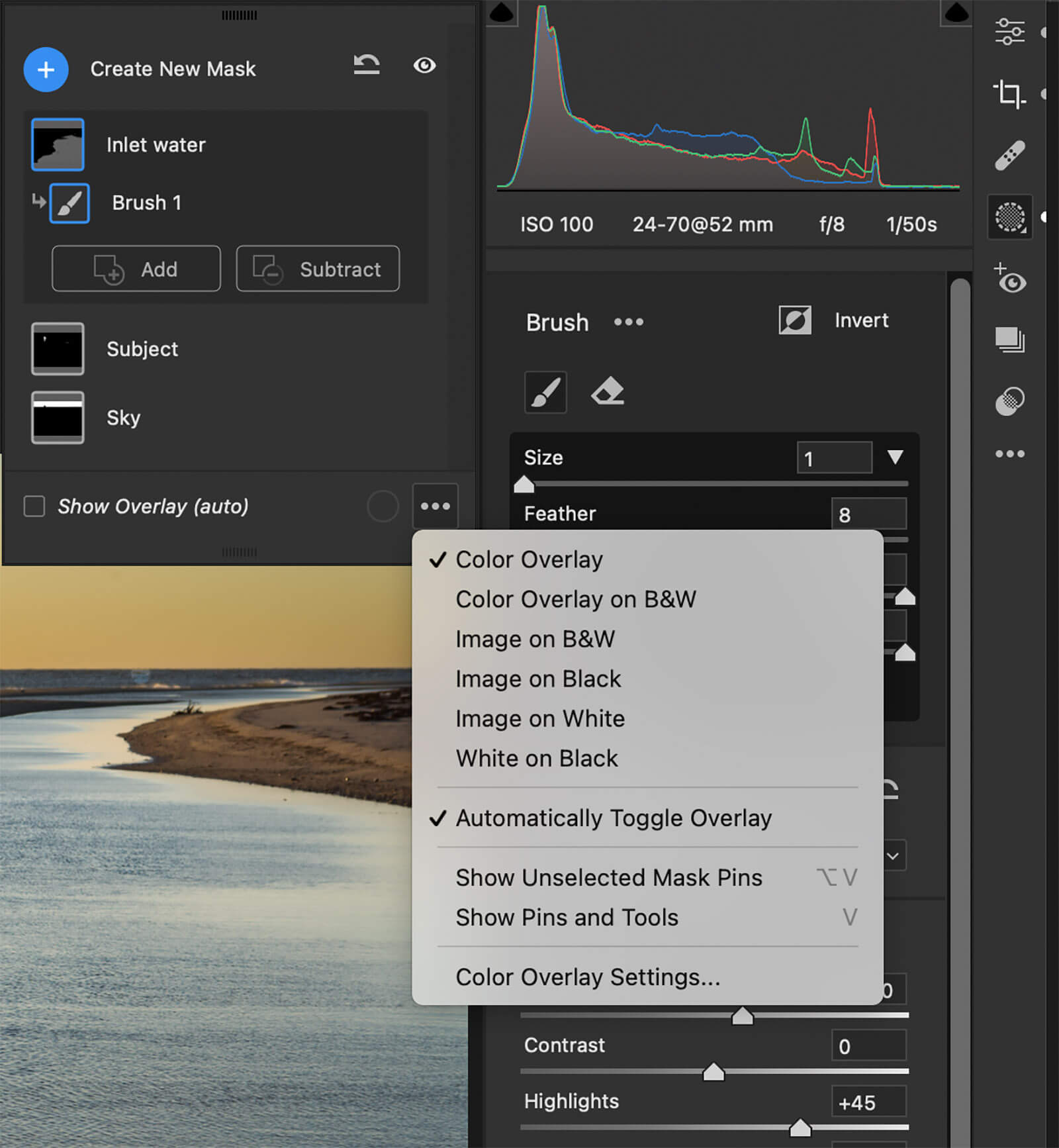 At the bottom of the Masks panel is another 3-dot menu. This one controls how the overlay appears. In the previous version of masking the only control over how the mask looks was to change the color. Now, most of the options from Photoshop’s Select and Mask can be chosen.