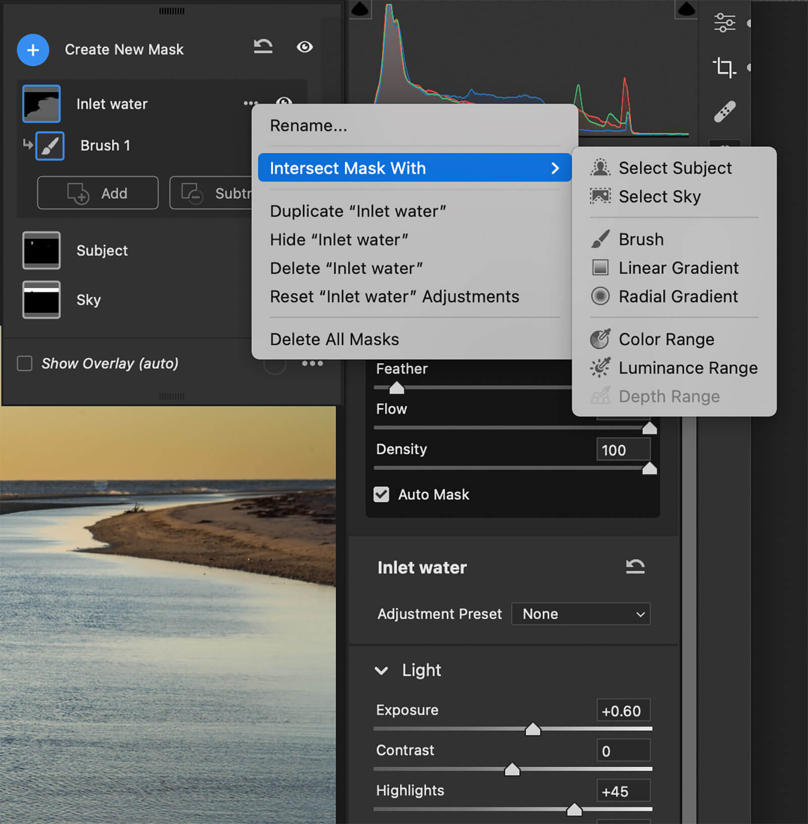 Click this to rename, duplicate, hide, delete, reset adjustments or delete all of the masks. The Intersect Mask With option opens a menu to modify the mask with Select Subject, Select Sky, Brush, Linear Gradient, Radial Gradient, Color Range and Luminance Range tools.