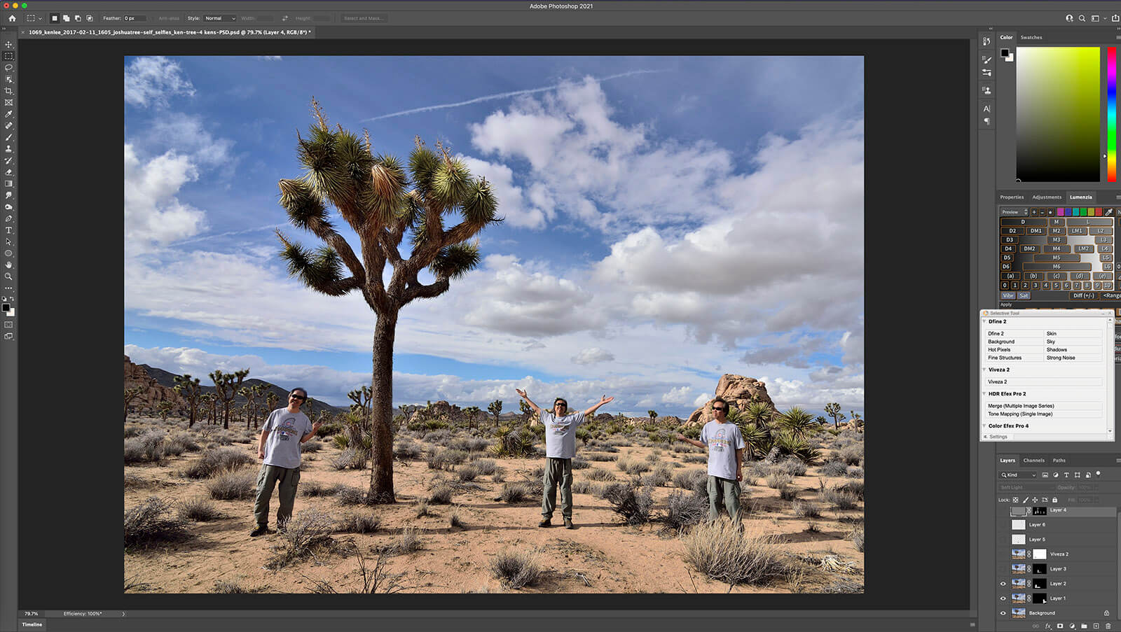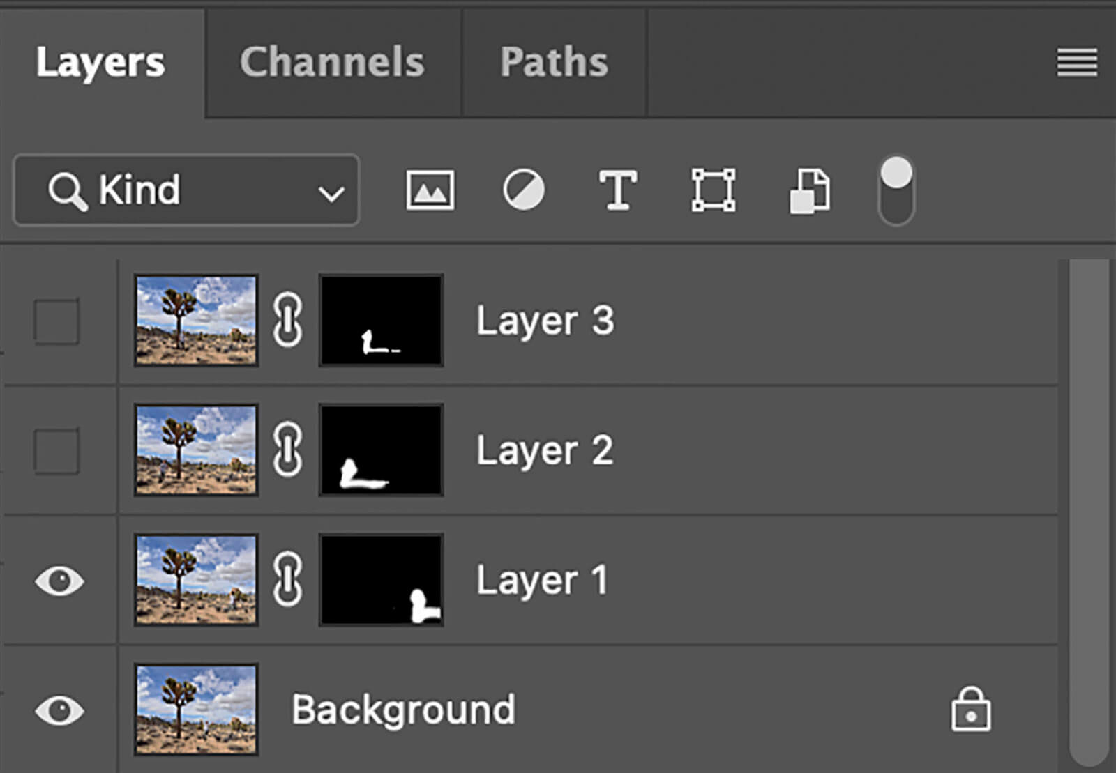 First, “turn off” all the photos except for the bottom two layers. Do this by clicking on the eye icon in Layers (bottom right of Photoshop, where you see all the photos stacked).